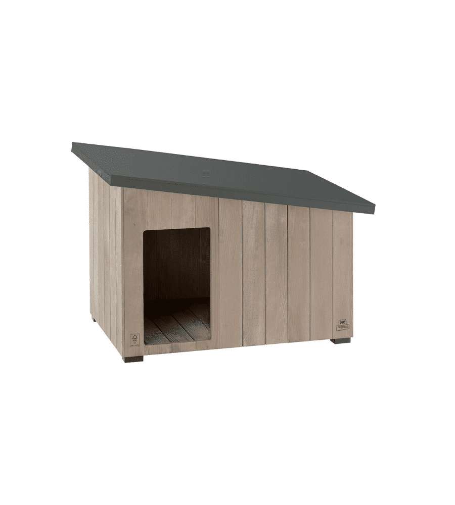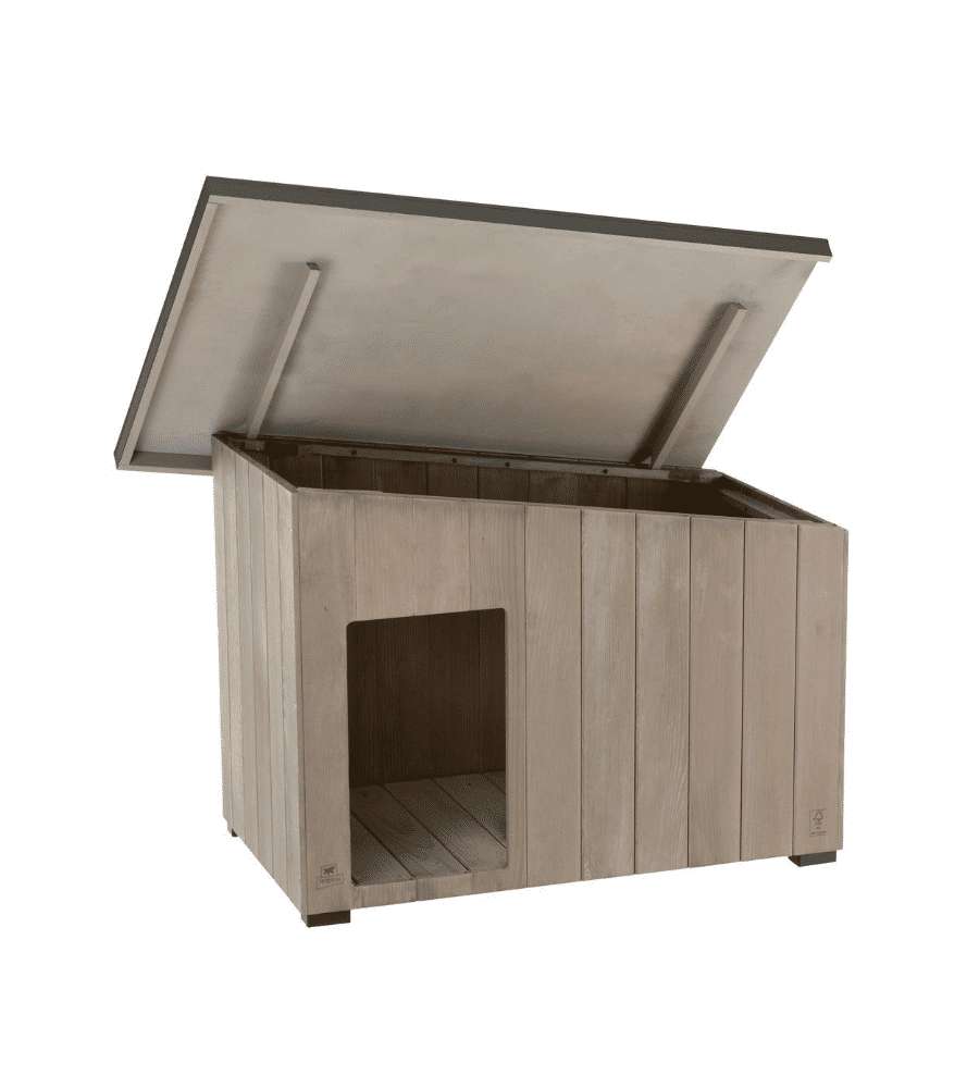Cuccia da esterno in legno di pino nordico certificato FSC, vernice atossica e repellente all'acqua. Tetto spiovente apribile per facile pulizia, piedini isolanti. Dimensioni interne: 83 x 47 x 60 cm, resistente agli agenti atmosferici.Dimensioni con tetto: