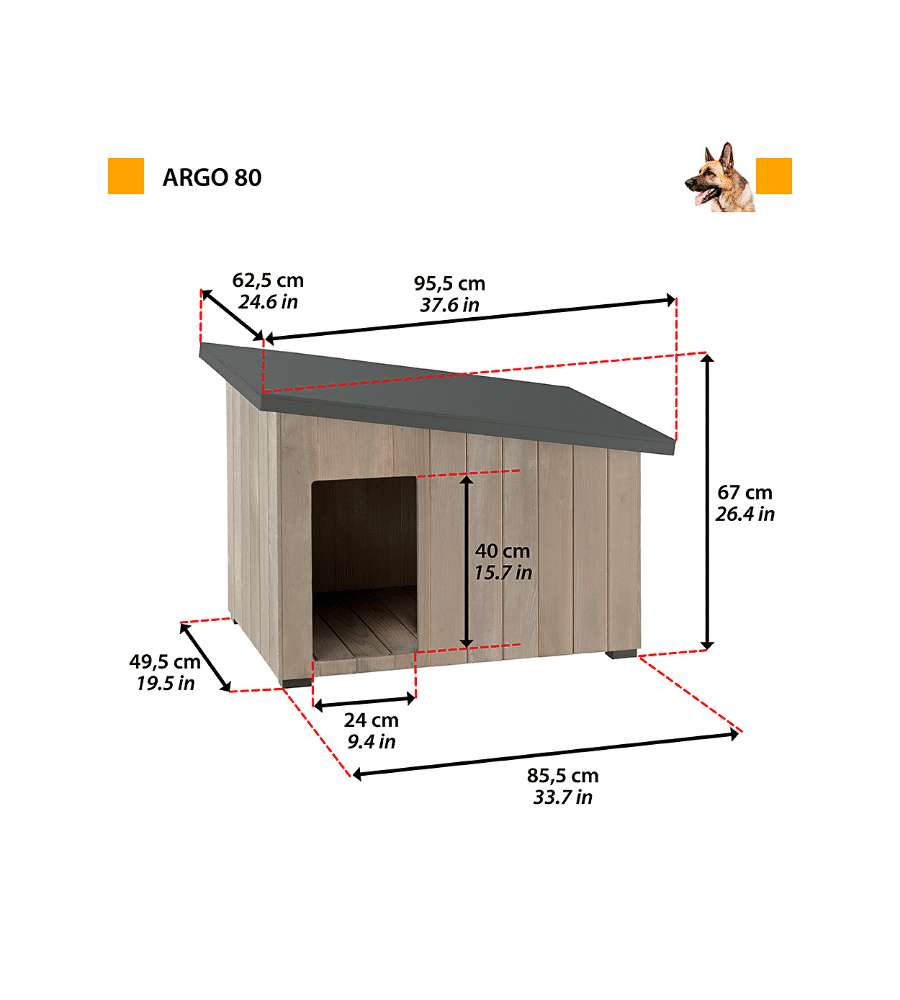 Descrizione: Cuccia da esterno Ferplast Argo 80 in legno di pino FSC, vernice atossica e resistente ai raggi UV. Tetto apribile, piedini isolanti e porta laterale. Dimensioni 83 x 47 x h 60 cm. Proteggi il tuo cane!
