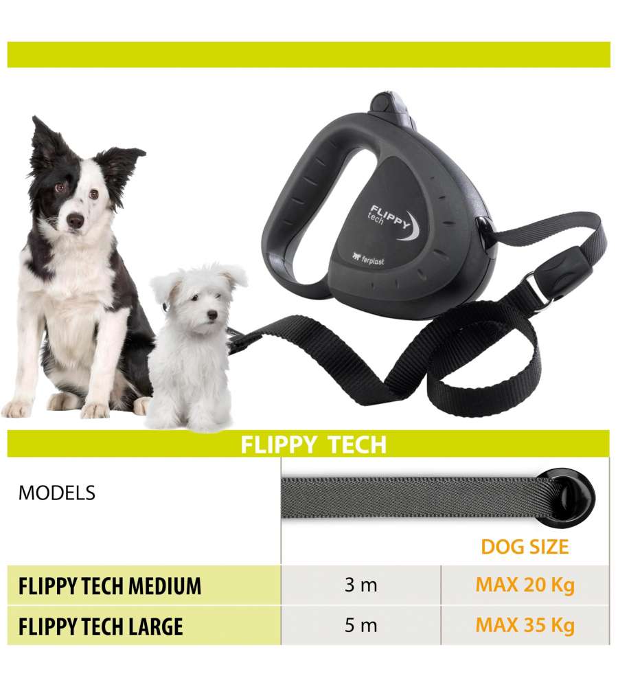 Descrizione: Guinzaglio retrattile Ferplast "Flippy Tech Tape" nero, taglia M, con fettuccia estensibile fino a 3 m e pulsante ergonomico. Robusto e leggero, ideale per cani fino a 20-25 kg. Comfort e praticità in un unico prodotto!