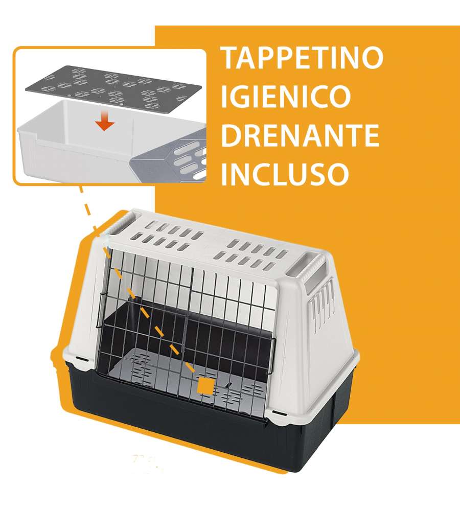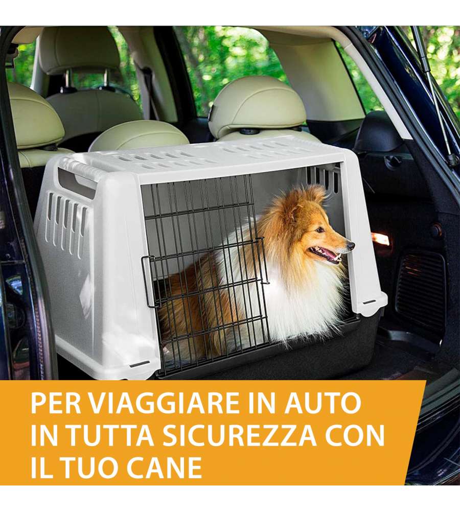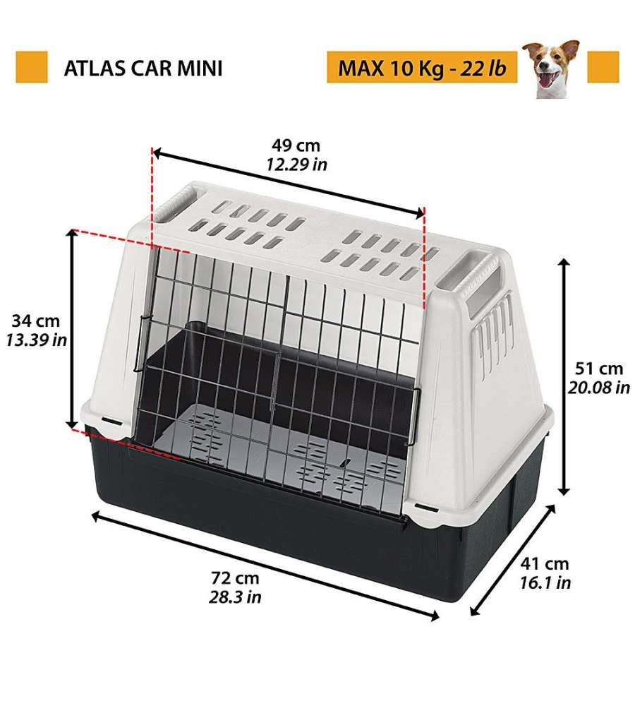 Trasportino per cani Ferplast Atlas Car Mini in plastica lavabile, dimensioni 72x41x51 cm, portata fino a 10 kg. Porta scorrevole bidirezionale, maniglie ergonomiche, ampie griglie di ventilazione e tappeto drenante incluso per comfort e igiene.Composizione:
