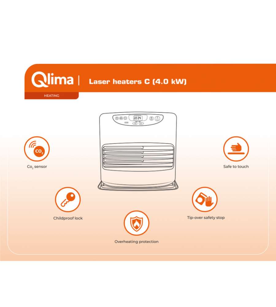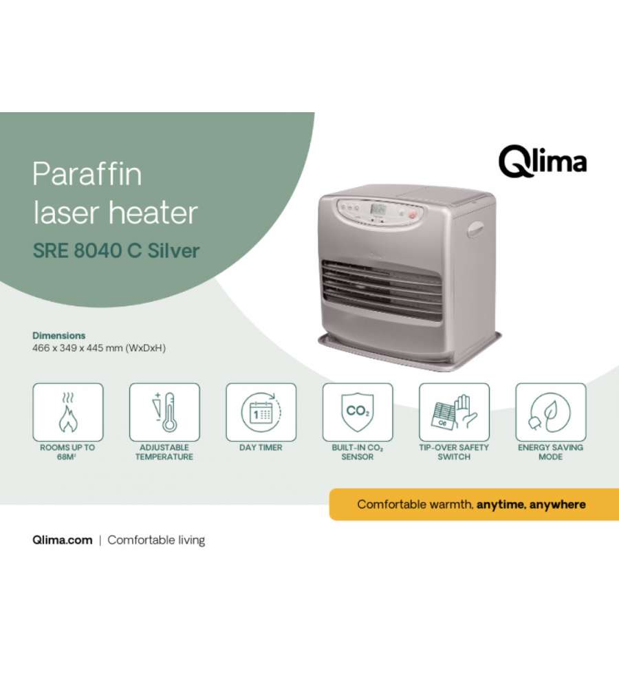 La STUFA A COMBUSTIBILE LIQUIDO Qlima SRE 8040 C è una stufa elettronica che consente di programmare l'accensione per ottenere la temperatura desiderata all'orario prescelto. In questo modo è possibile trovare un ambiente caldo e confortevole appena rientrati a casa. Necessita solo di una presa elettrica e non c’è bisogno di nessuna installazione; con una potenza massima di 4 kW è adatta a scaldare ambienti fino a 170 m³. Questa stufa a combustibile è dotata di varie funzioni per rendere il suo uso ancora più efficiente e sicuro: il programma “save” contiene i consumi, il sistema "fuzzy logic" ed il termostato permettono una migliore regolazione della temperatura, la funzione "comfort" aiuta a prolungare il tempo del rifornimento, i sistemi di sicurezza anti-ribaltamento, anti-surriscaldamento ed il blocco di sicurezza per i bambini garantiscono un uso sicuro dell’apparecchio. Il Sensore di CO2 monitora costantemente la qualità dell'aria e il dispositivo si spegne quando è necessaria una ventilazione aggiuntiva. Questo modello di stufa laser a combustibile dispone di un serbatoio da 9 litri e può offrire un’autonomia di riscaldamento fino a 67 ore. Per il corretto funzionamento e per la validità della garanzia, si raccomanda l'utilizzo di combustibili originali Qlima.