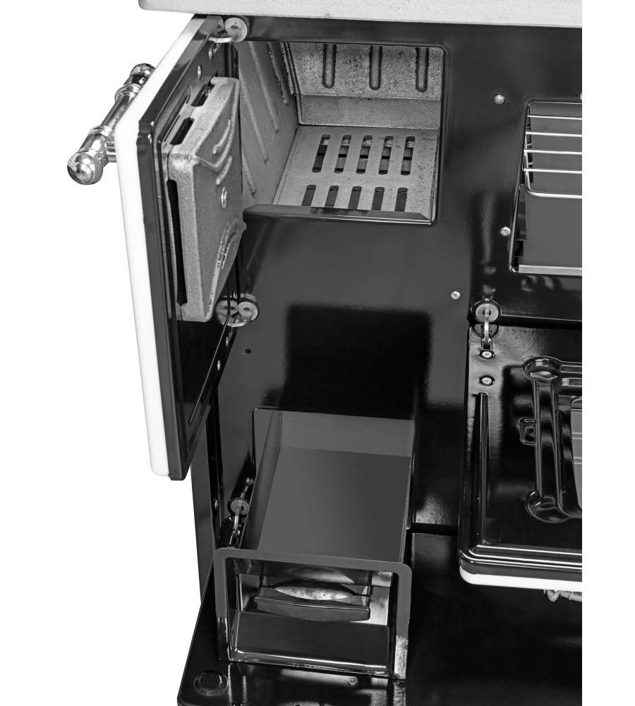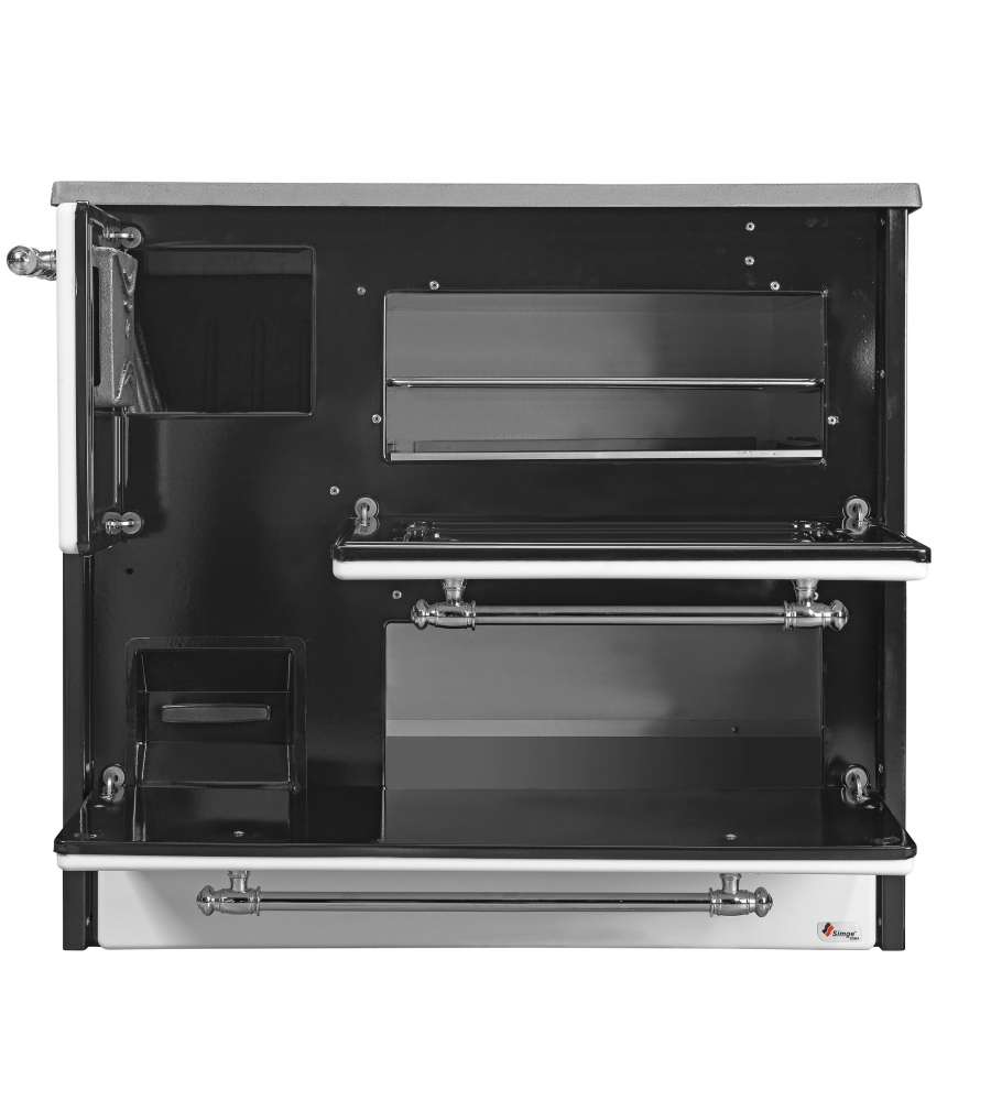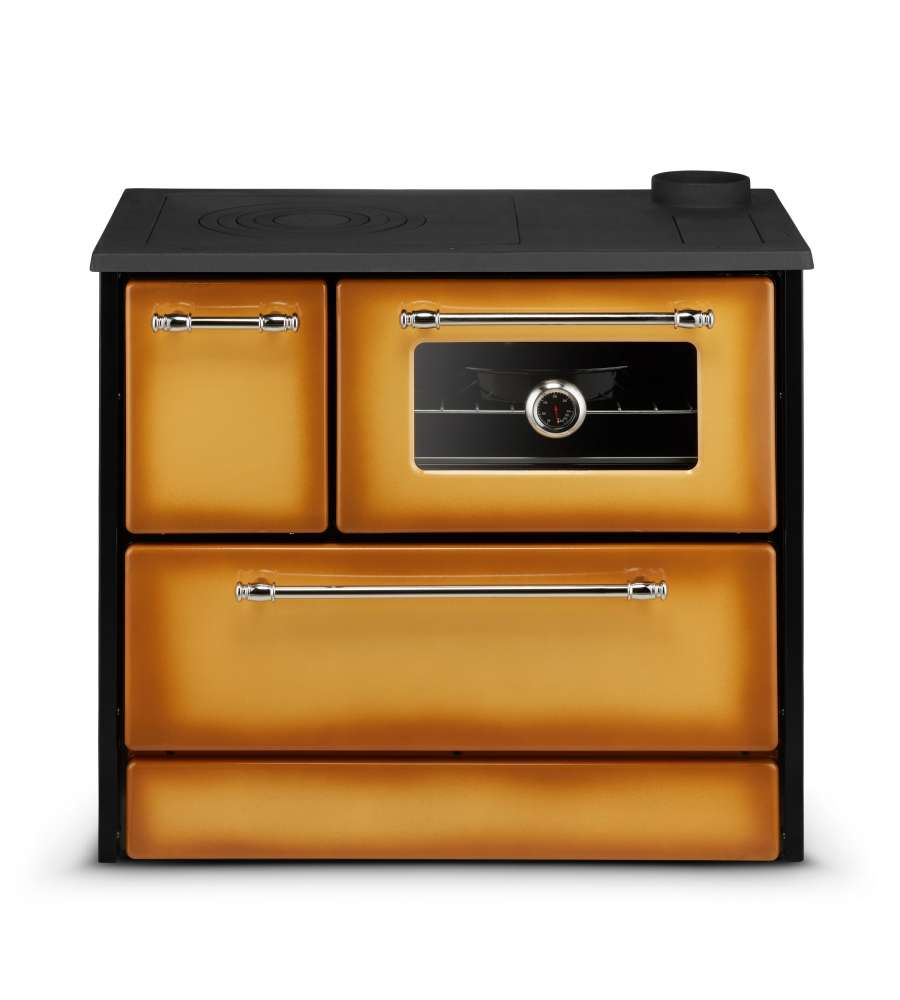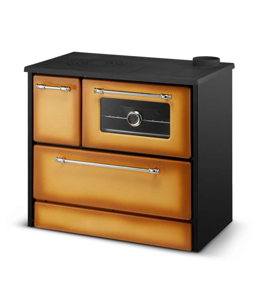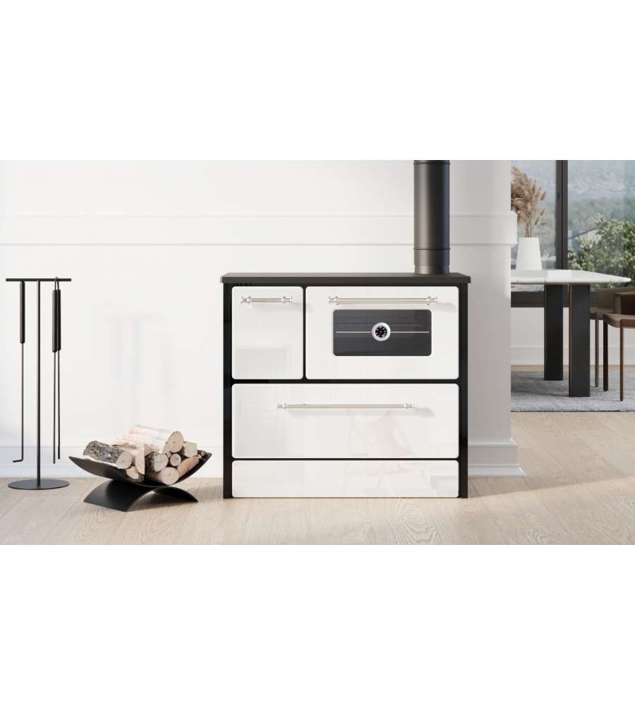 Cucina a legna con potenza di 9 kW, classe energetica A, efficienza 79%. Dimensioni compatte (L 87 x P 51 x H 79 cm), peso 80 kg. Struttura in acciaio/ghisa, uscita fumi 13 cm, consumo 3,47 kg/h. Maniglie cromate e certificazione ECODESIGN.Destinazione d'uso: