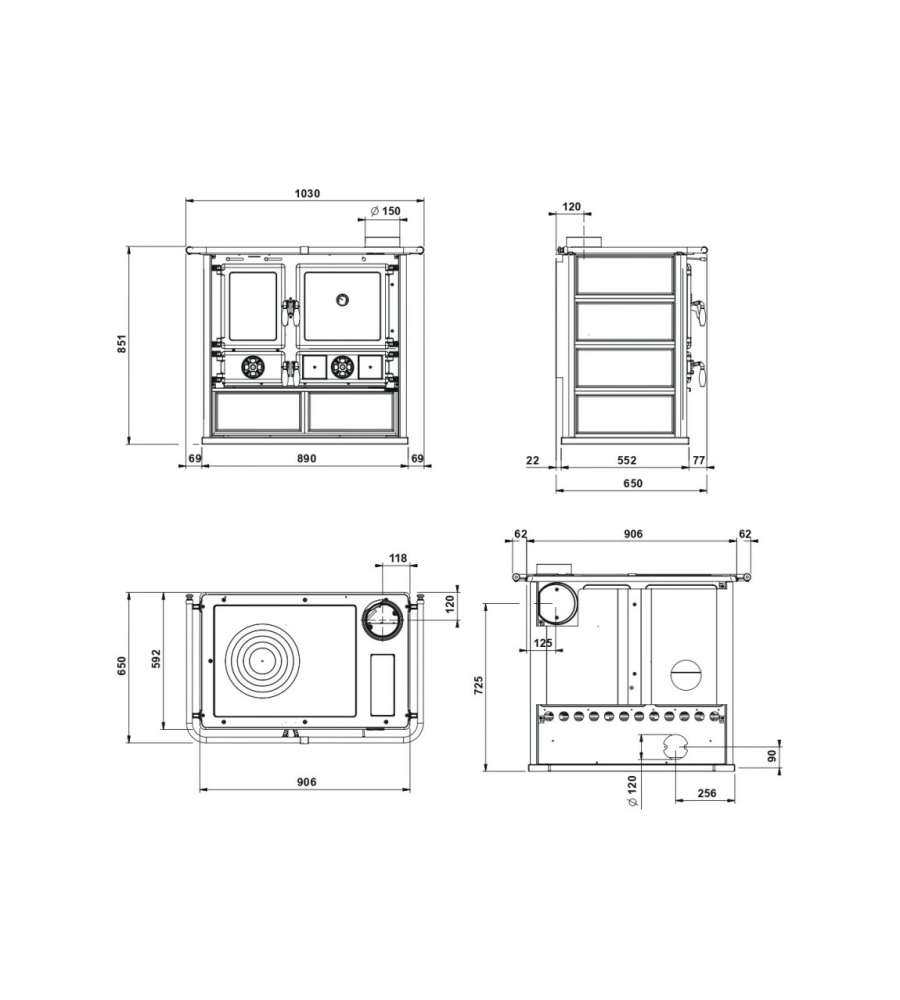 Cucina a legna con sistema di post combustione per basse emissioni, porte e telaio in ghisa, vetro ceramico autopulente. Potenza 8,8 kW, riscalda 252 m3, peso 200 kg. Design elegante in pietra naturale, efficienza energetica certificata.Destinazione d'uso: