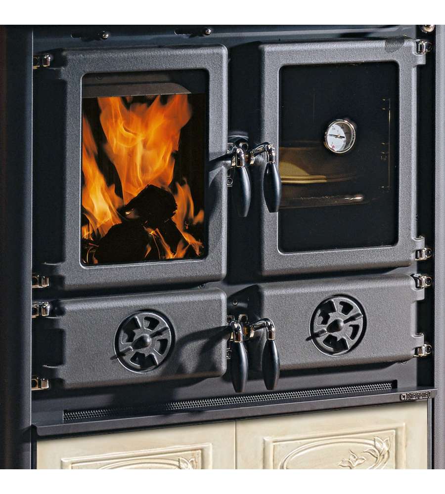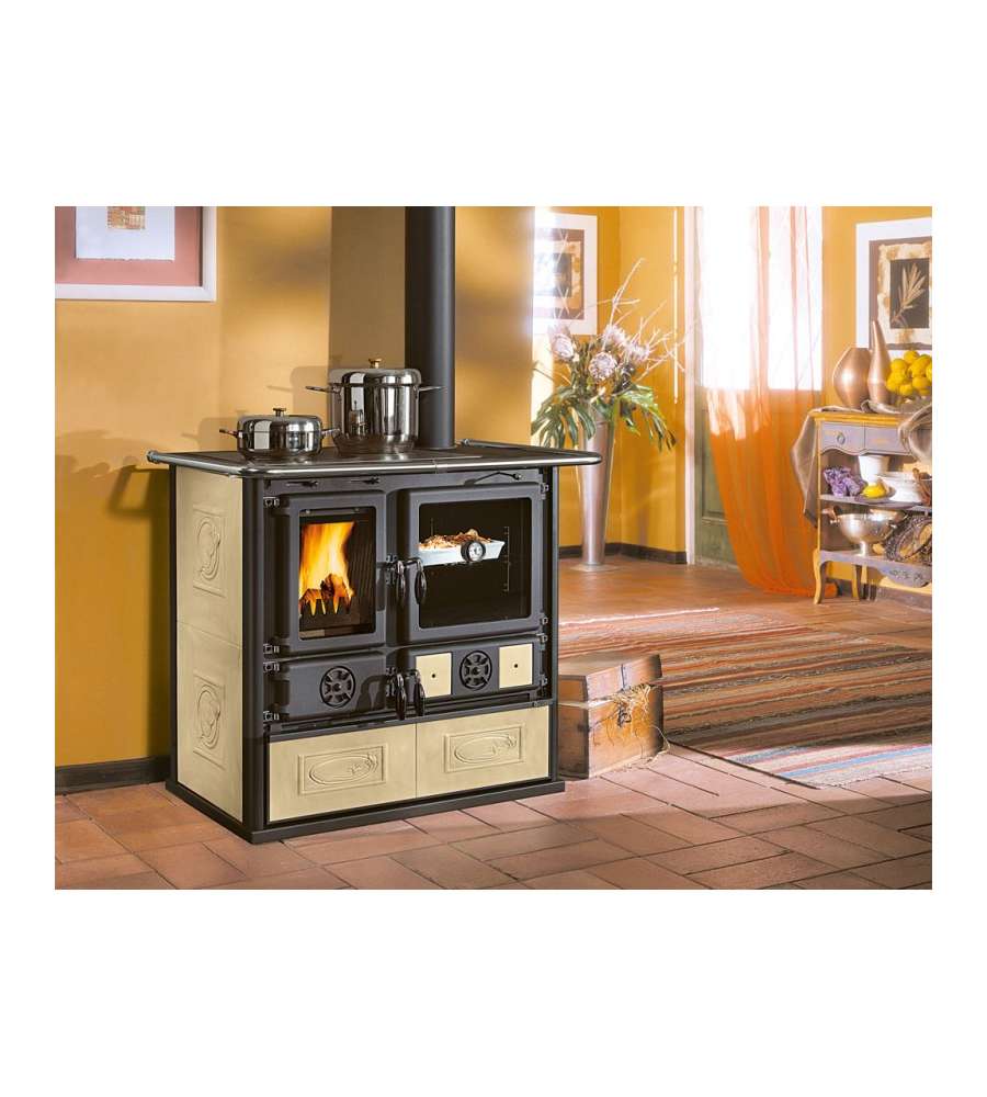 Cucina a legna La Nordica Rosetta Liberty in panna, con focolare in ghisa e porte smaltate. Potenza di 7,9 kW, rendimento dell'86,9% e capacità di riscaldamento fino a 226 m³. Dotata di cassetto cenere estraibile e cassettone porta legna.Destinazione d'uso: