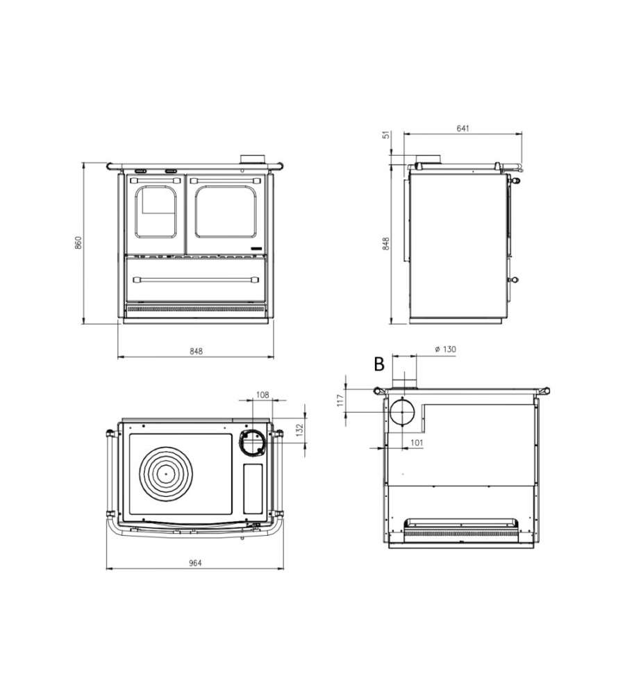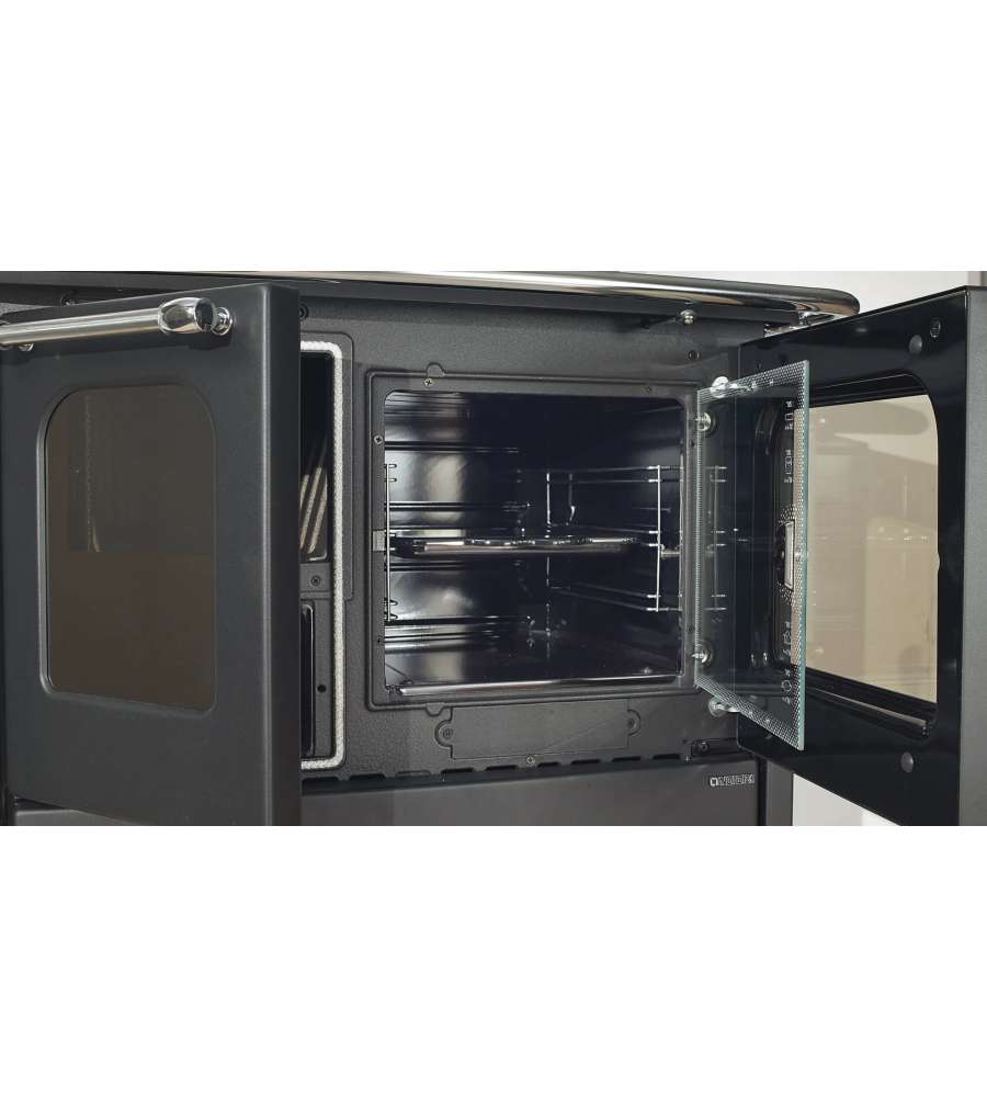 Focolare in ghisa, porte in acciaio smaltato, facciata e telaio in ghisa, piastra e cerchi in ghisa levigata, forno in acciaio smaltato porcellanato, porta fuoco in vetro con interno ceramicoCombustibile: