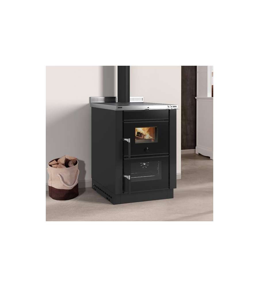 Cucina a legna con focolare in ghisa e Nordiker, porta fuoco in ghisa con triplo vetro, telaio in acciaio inox, cassetto cenere estraibile, regolazione automatica aria, dimensioni (LxPxH) 600x600x850-910 mm. Certificazione Ambientale DM186 4 Stelle.Destinazione d'uso: