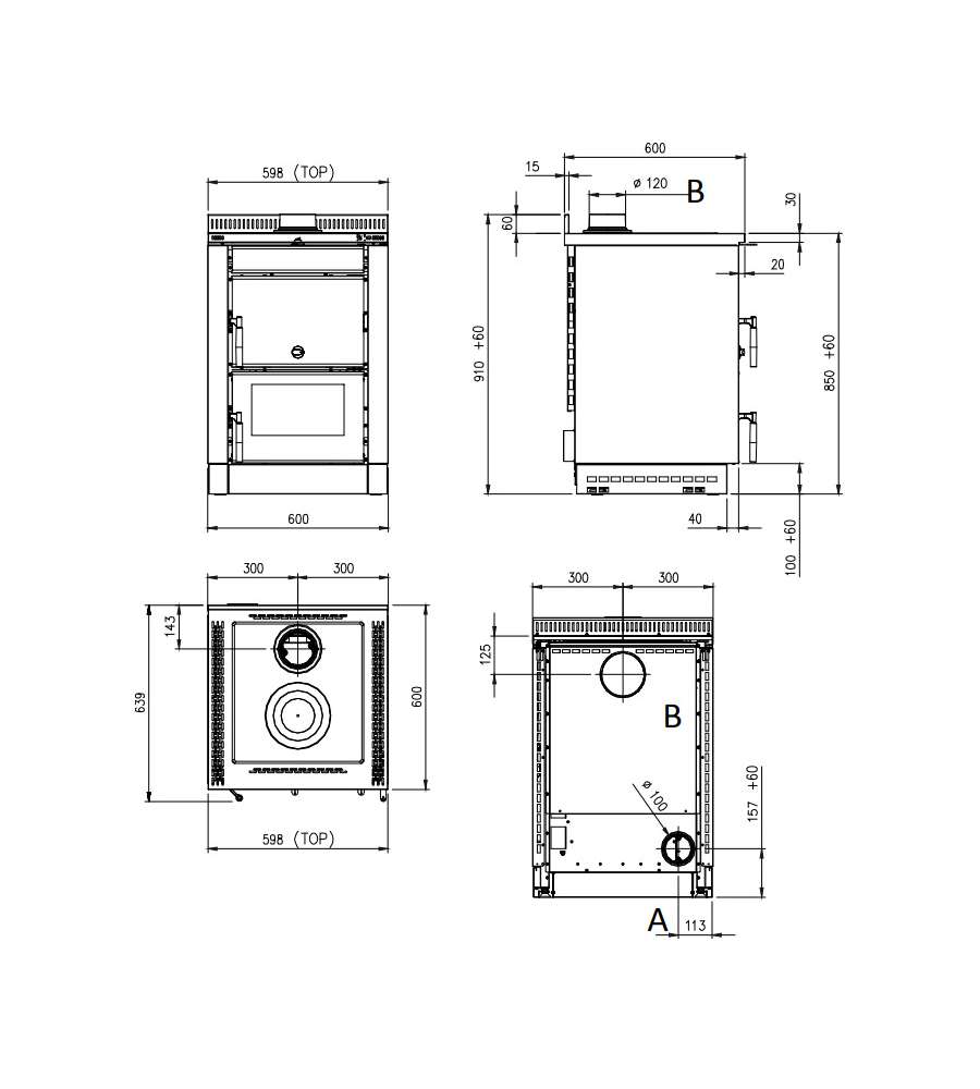 Cucina a legna con focolare in ghisa e Nordiker, porta fuoco in ghisa con triplo vetro, telaio in acciaio inox, cassetto cenere estraibile, regolazione automatica aria, dimensioni (LxPxH) 600x600x850-910 mm. Certificazione Ambientale DM186 4 Stelle.