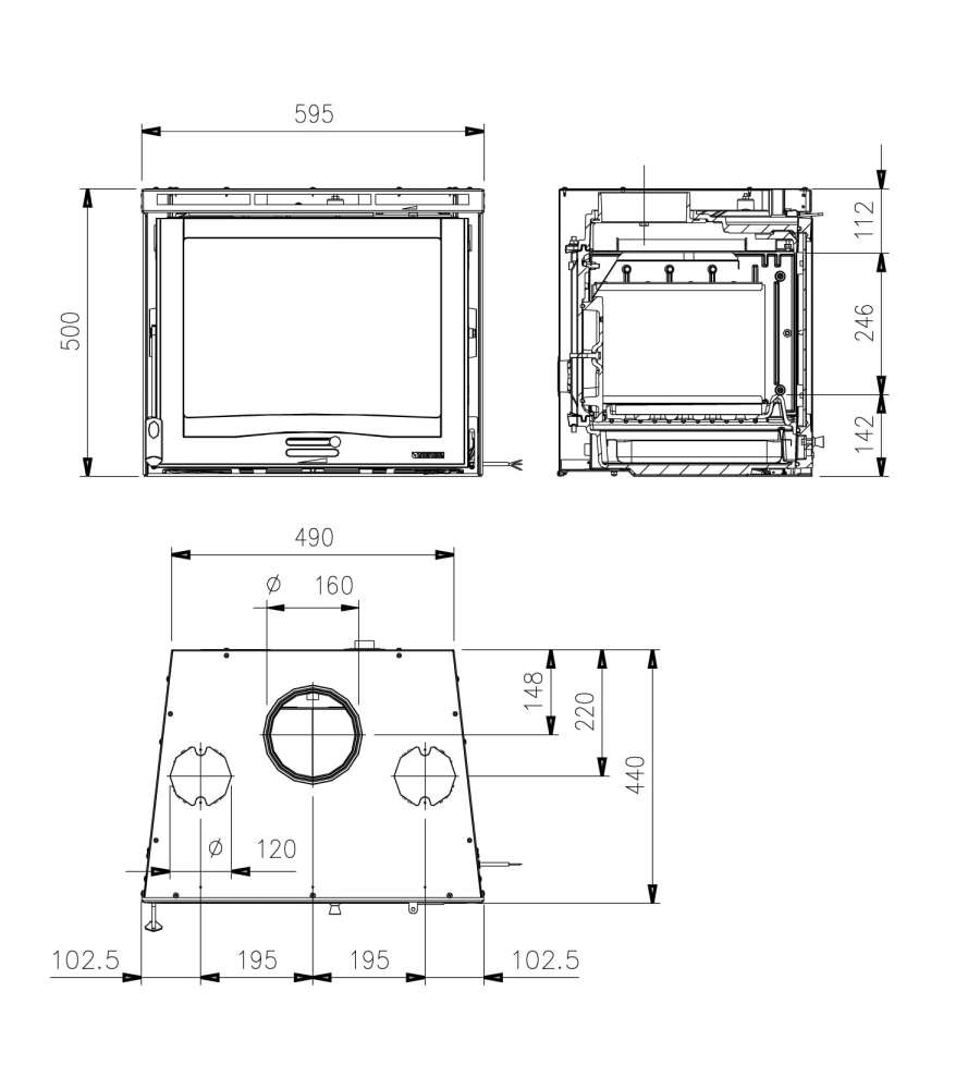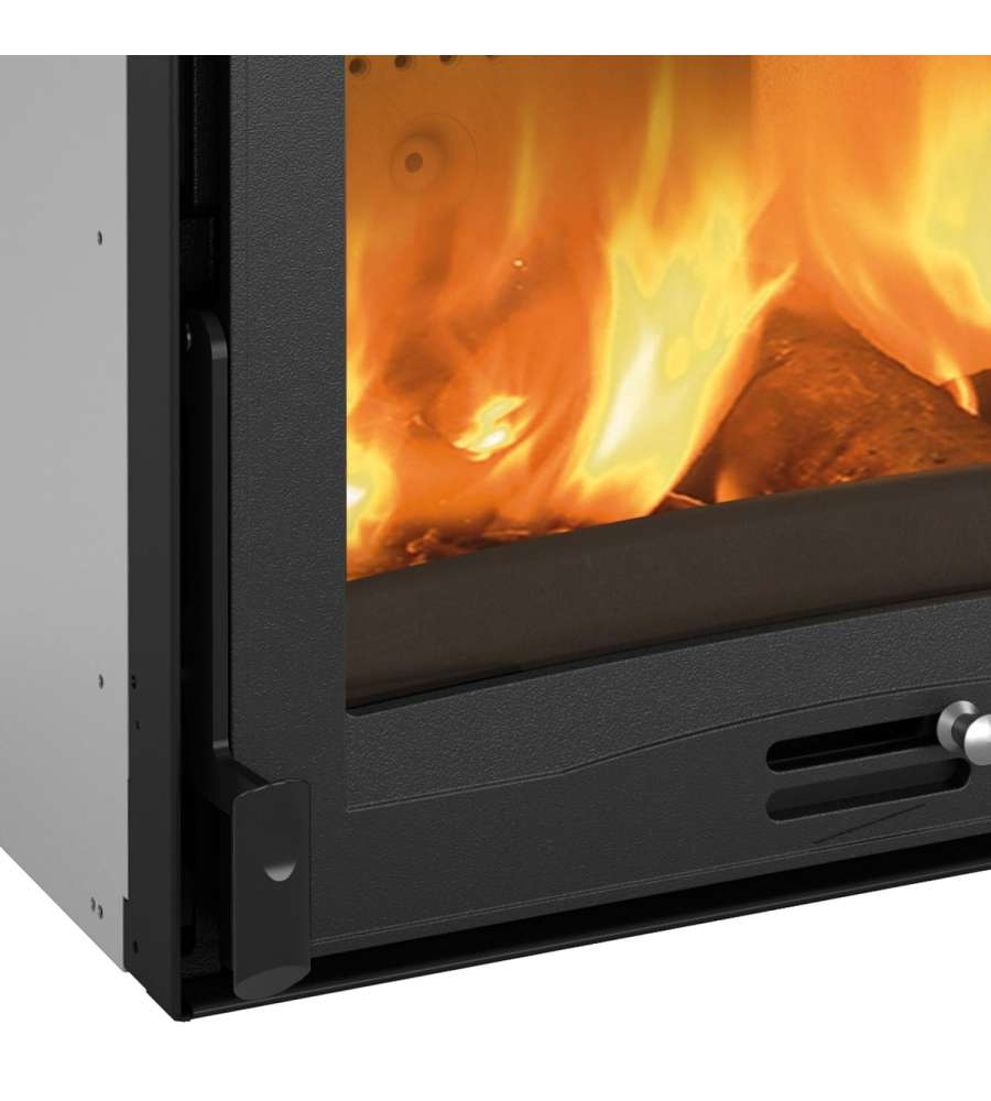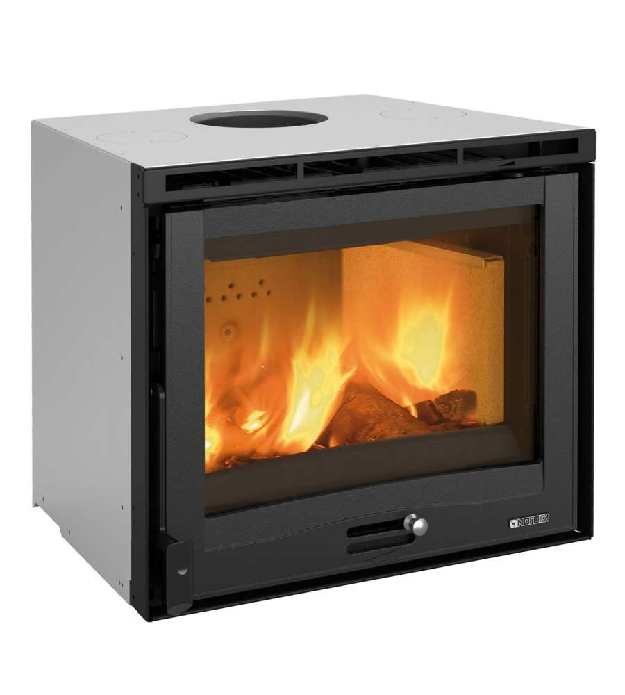 Inserto caminetto a legna con focolare in ghisa e vermiculite, potenza 6,5 kW, riscalda fino a 186 m³. Cassetto cenere estraibile, aria regolabile, sistema di post-combustione. Certificazione A+, rendimento 80,8%. Dimensioni 60x44x50 cm.Combustibile: