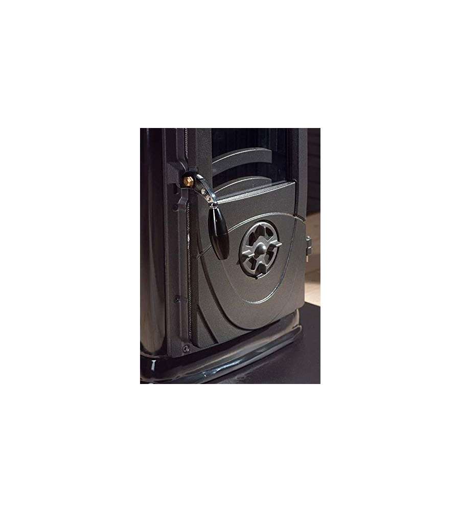 Stufa a legna con design panoramico in acciaio smaltato, focolare e top in ghisa. Potenza di 5 kW, rendimento 80%, riscalda fino a 143 m³. Vetro ceramico, aria regolabile, cassetto cenere estraibile, classe energetica A.Destinazione d'uso: