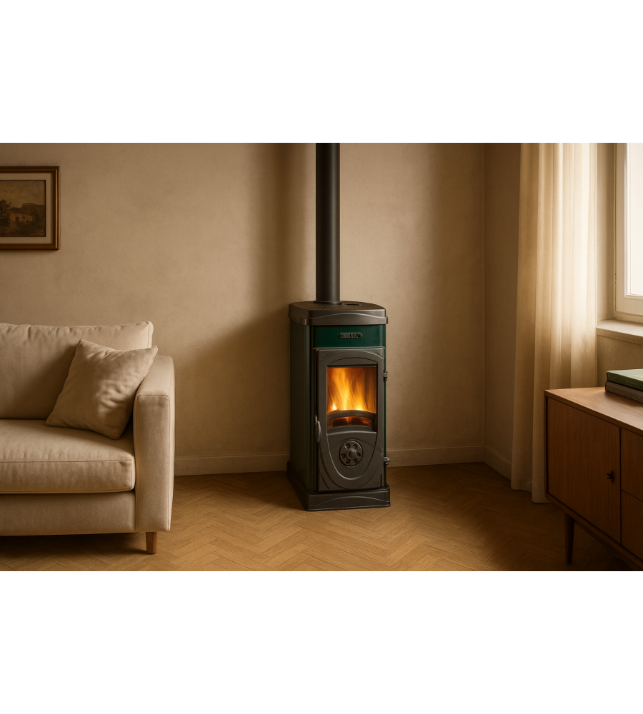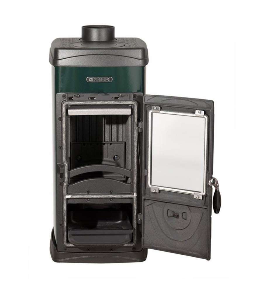 Descrizione: Scopri la Stufa a Legna Super Junior Verde di La Nordica: design elegante in acciaio smaltato, focolare in ghisa e rendimento dell'80%. Riscalda fino a 143 m³ con potenza di 5 kW. Ideale per il tuo comfort domestico!
