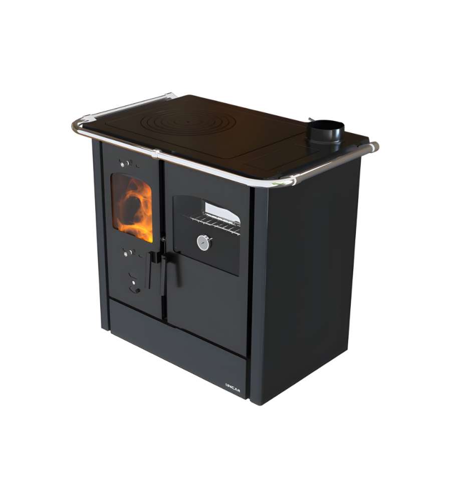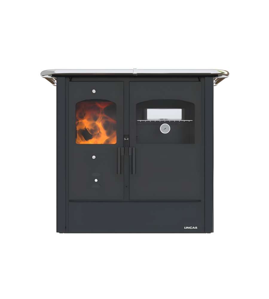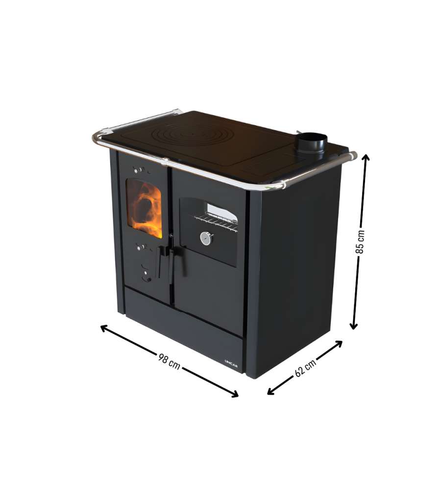 Cucina a legna Lincar Nada 4,5 kW, struttura in acciaio smaltato, focolare in ghisa e vermiculite, piastra in ghisa. Dimensioni 98x62x83 cm, peso 120 kg, superficie riscaldabile 221 mc, potenza 9,33 kW, colore antracite.Destinazione d'uso: