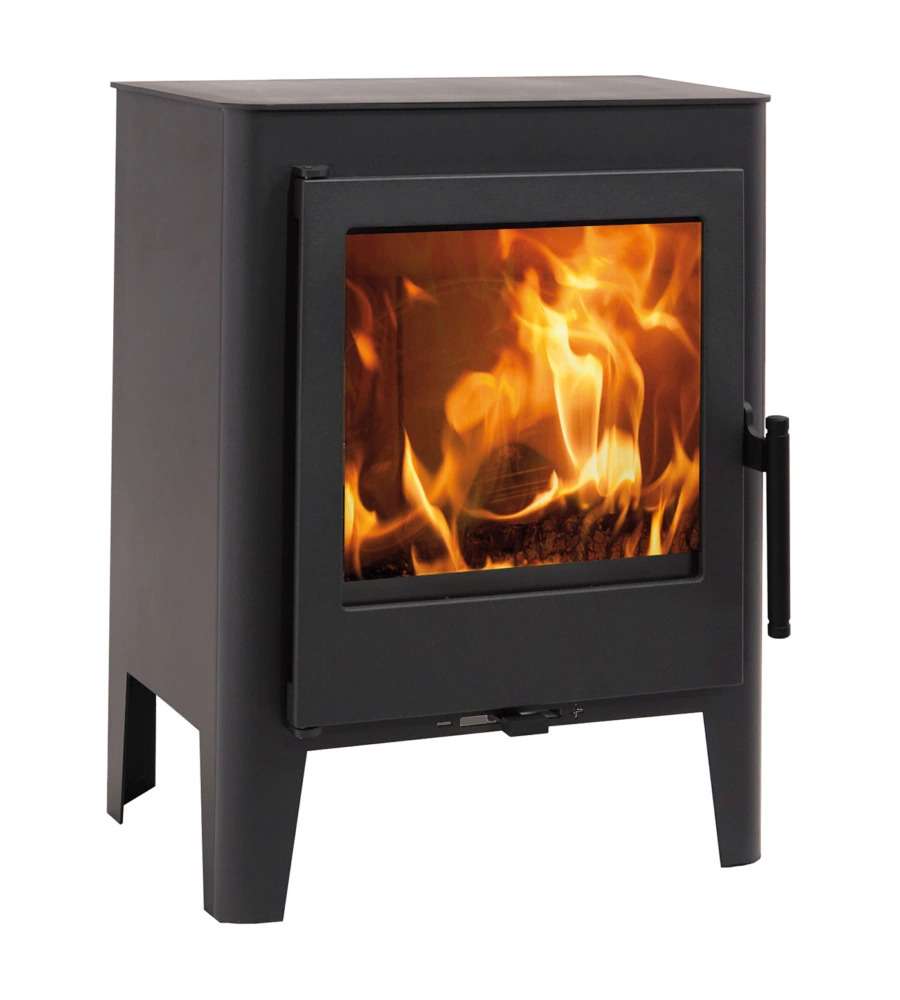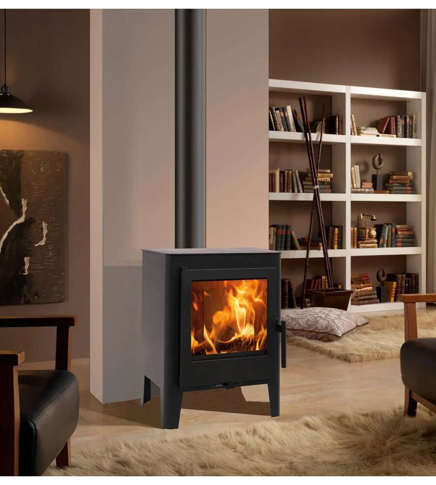 Stufa a legna Panadero Skara da 5,9 kW, Classe A, con rendimento del 77% per ambienti fino a 180 m³. Tripla combustione, vetro sempre pulito e porta legna integrata. Costruzione robusta in acciaio e ghisa. Certificata Ecodesign e Flamme Verte.Scarico fumi: