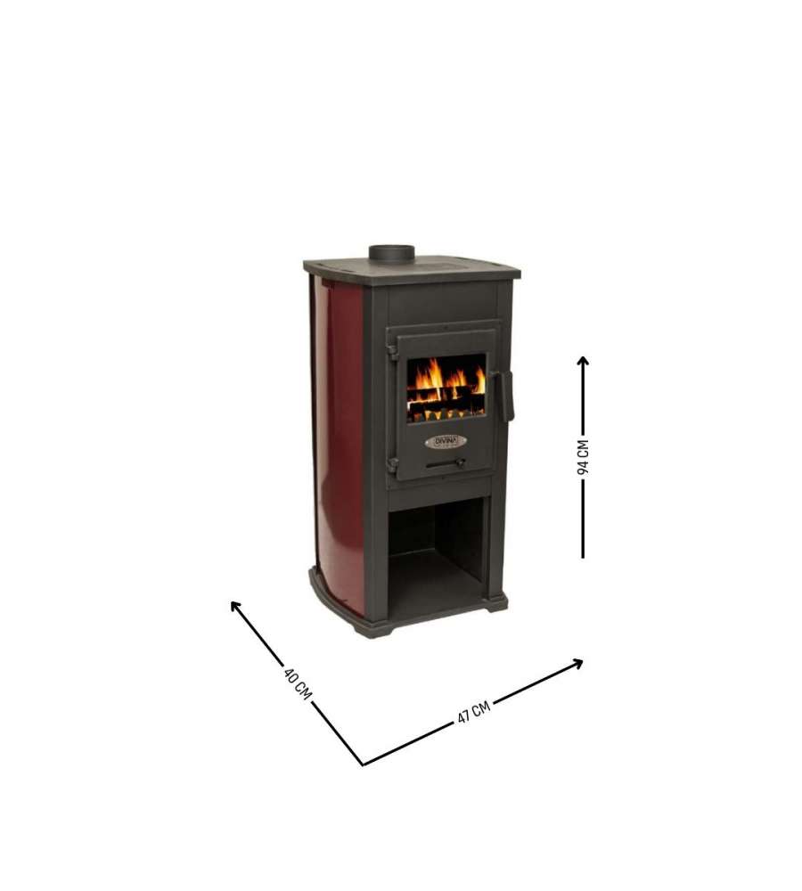 Stufa a legna Katerina in ghisa, colore bordeaux. Potenza 8,45 KW, dimensioni 47x40x94 cm. Camera combustione 310x390x345 mm. Riscalda 40-60 m². Classe A+.Destinazione d'uso: