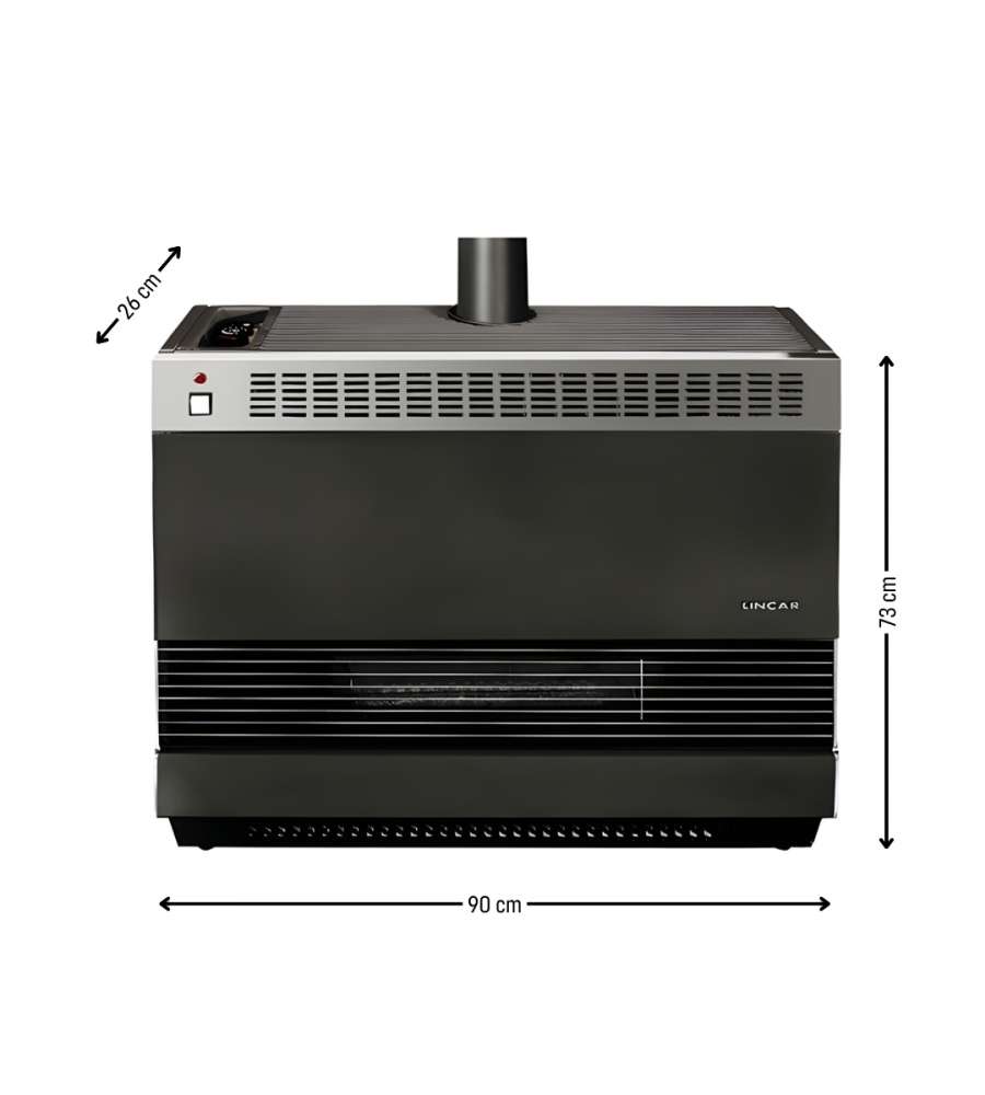 Descrizione: Stufa a gas Lincar potenza 12000 W, predisposta metano, dimensioni 90x26x73 cm. Con accensione piezoelettrica e ventilazione forzata, è ideale per riscaldare con efficienza diversi ambienti. Trasformabile GPL. Colore nero.