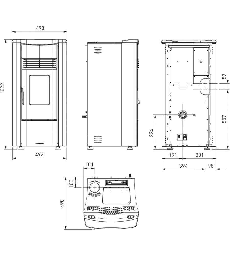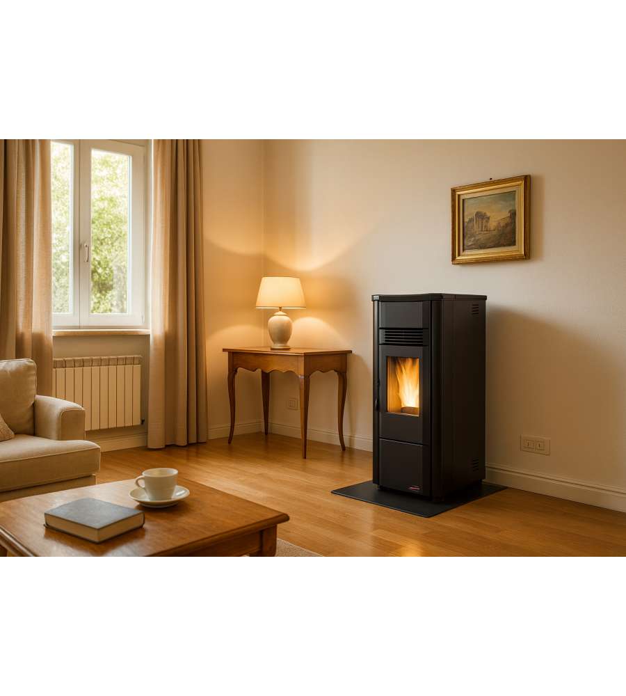 Stufa a pellet ventilata con design classico, rivestimento in acciaio verniciato e top in maiolica. Potenza termica di 3-7 kW, serbatoio da 15 kg, rendimento fino al 92%. Funzione Pro Air Setup per una ventilazione personalizzabile.Destinazione d'uso: