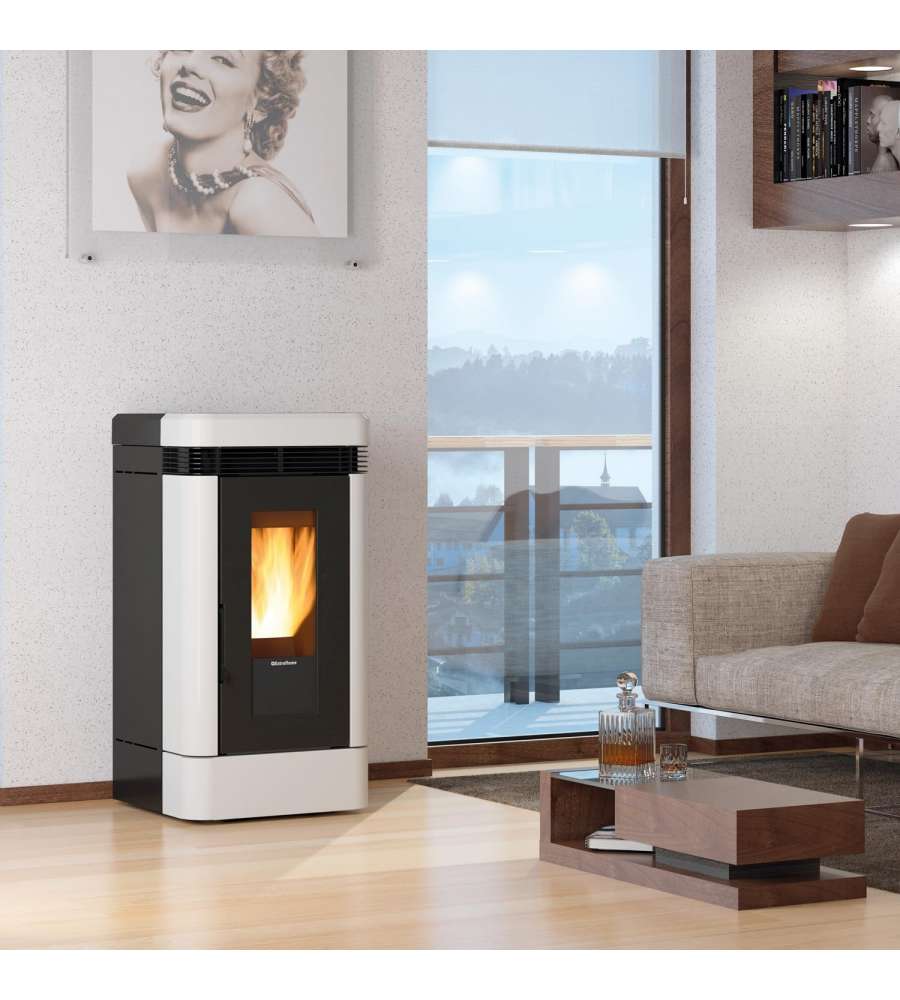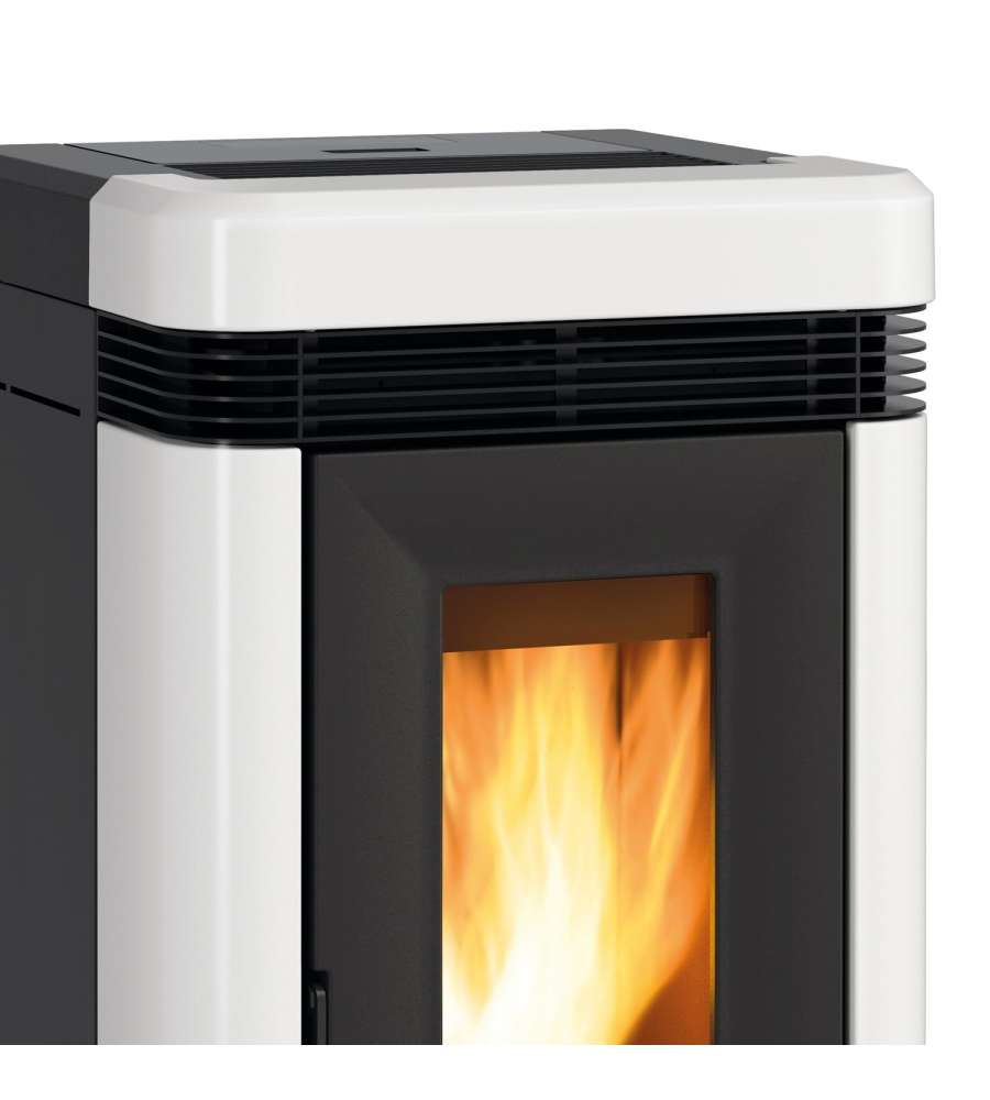 Stufa a pellet con alimentazione automatica, canalizzabile, serbatoio da 27 kg. Potenza 3,6/12 kW, superficie riscaldabile 344 mc. Wi-Fi integrato, gestione da remoto, struttura in acciaio e rivestimento in maiolica. Dimensioni 56x59x109 cm.Destinazione d'uso: