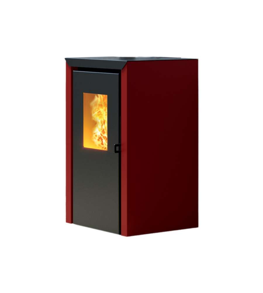 Stufa a pellet ventilata Invicta Bassano, potenza termica 4,5 kW, potenza nominale 4,2 kW. Capacità serbatoio 8kg, autonomia 8h. Design in acciaio rosso, scarico fumi superiore diametro 80mm, silenziosa e programmabile. Classe energetica A+.Destinazione d'uso: