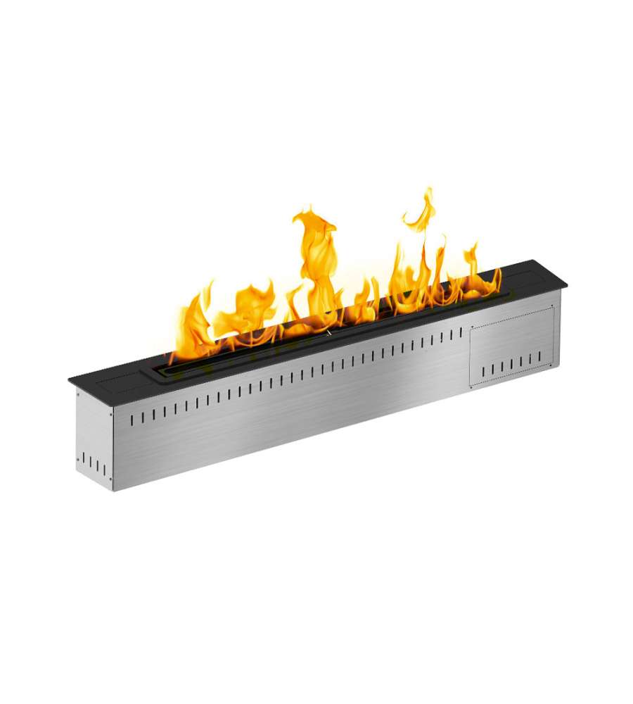 Inserto automatico Slim per camino a bioetanolo, potenza riscaldante 5-7 KW, controllo remoto e APP. Design elegante in acciaio inox, protezioni avanzate e materiali di alta qualità. Dimensioni: 61x12,8x16,8 cm, capacità 2,4 lt.Combustibile: