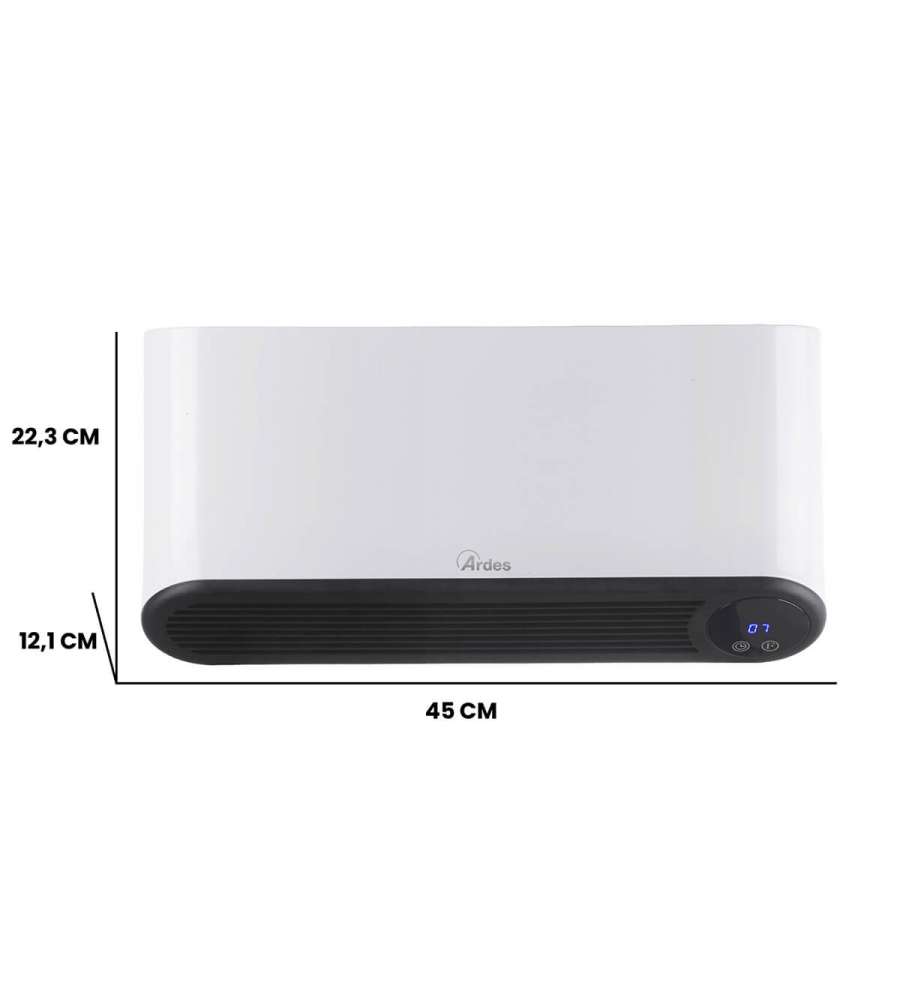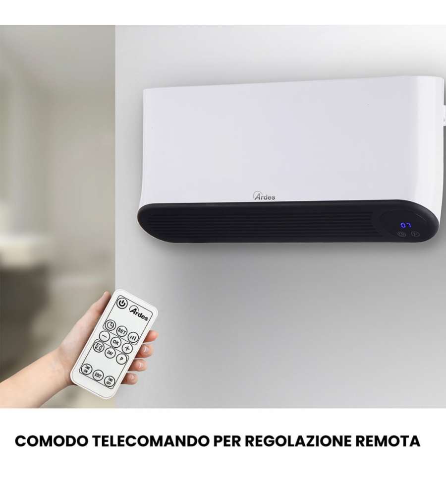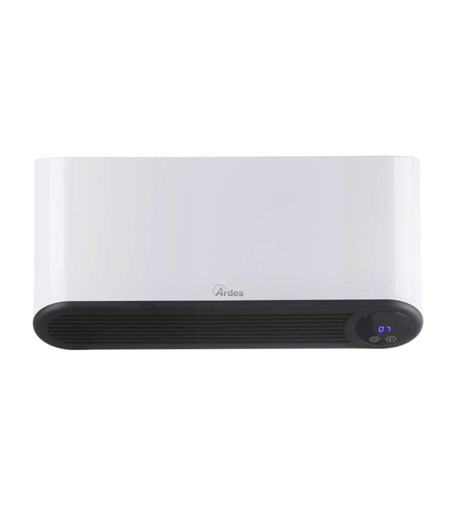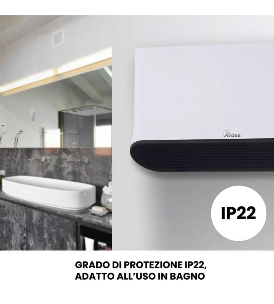Termoconvettore ceramico da parete Ardes, potenza 1000/2000W, con termostato regolabile, timer 12 ore e programmazione settimanale. Sicuro e waterproof (IP22), ideale per il bagno. Include telecomando e display LED per facile utilizzo.Destinazione d'uso: