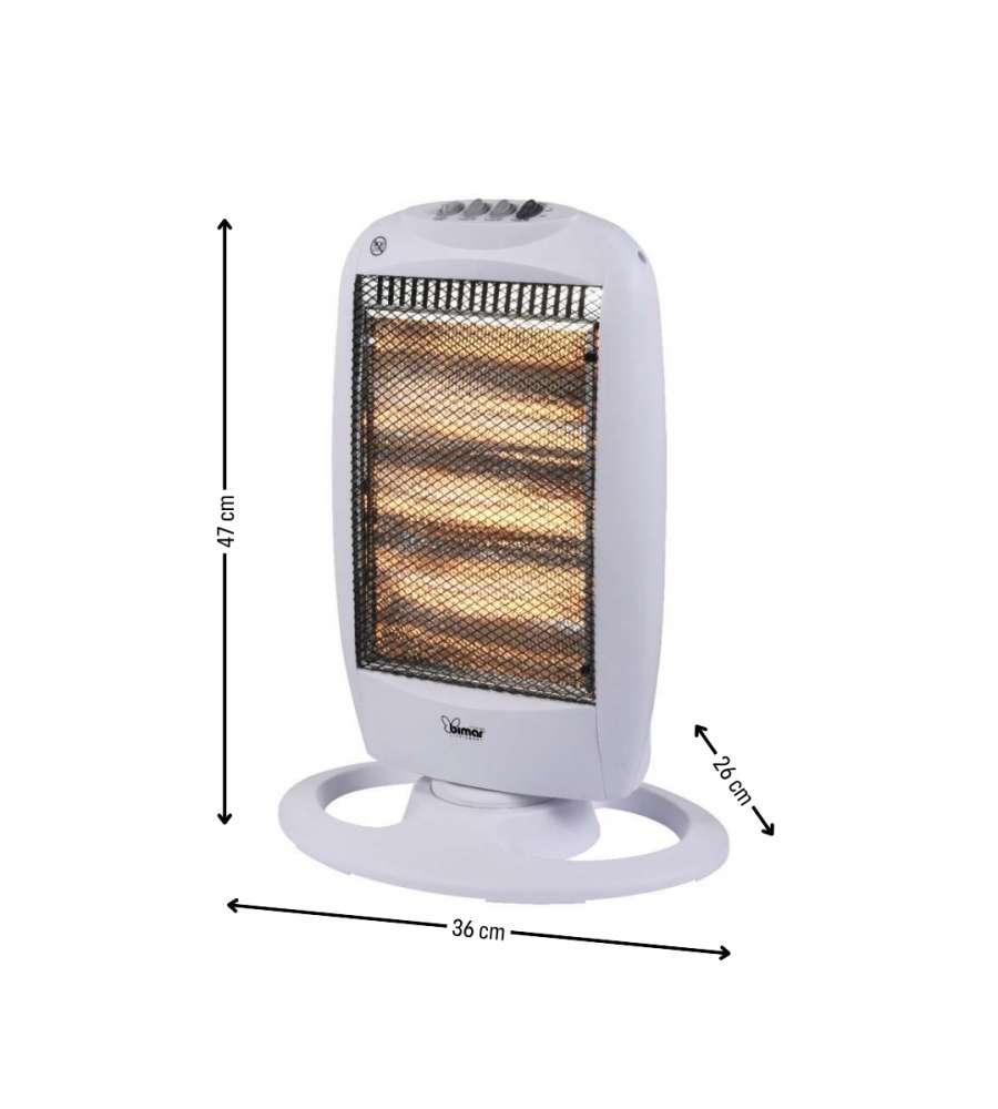 Stufa radiante alogena Bimar HR315, 3 potenze di riscaldamento (400W, 800W, 1200W). Silenziosa e orientabile, ideale per ambienti fino a 12 m². Include interruttore oscillante e antiribaltamento, grado di protezione IP20.Destinazione d'uso: