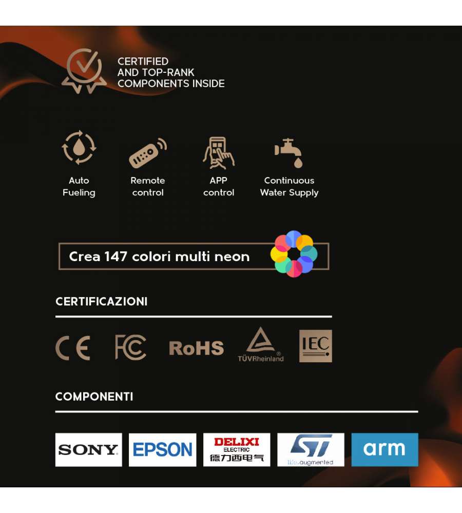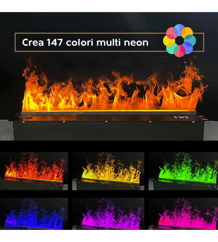 Descrizione: Inserto a vapore acqueo Divina Fire: elegante e moderno, offre un effetto fiamma realistico senza fumi. Controllo APP e telecomando, design a incasso, eco-friendly e sicuro. Perfetto per ogni ambiente! Dimensioni: 100x22,7x17,8 cm.