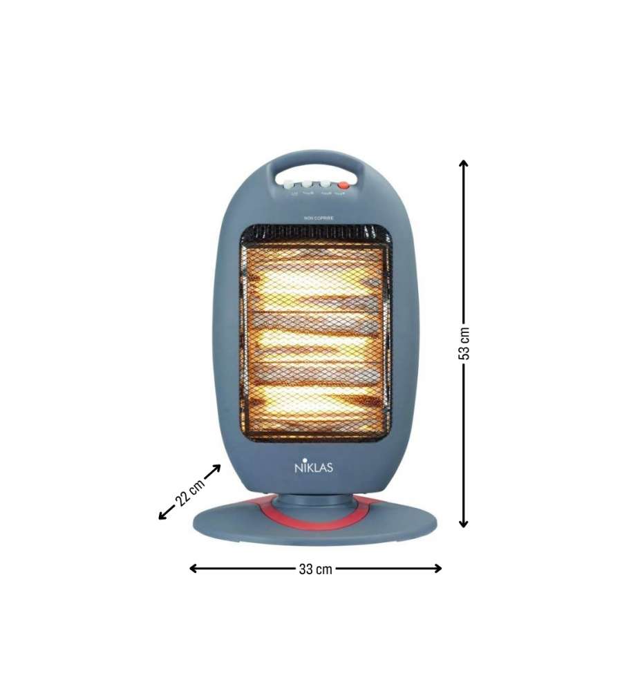 Descrizione: Stufa alogena Niklas Baby 1200W con corpo in ABS grigio. Potenza regolabile a 400-800-1200W, oscillante a 70°. Sicura e portatile, si spegne in caso di ribaltamento. Dimensioni compatte: 33x22xH53 cm.