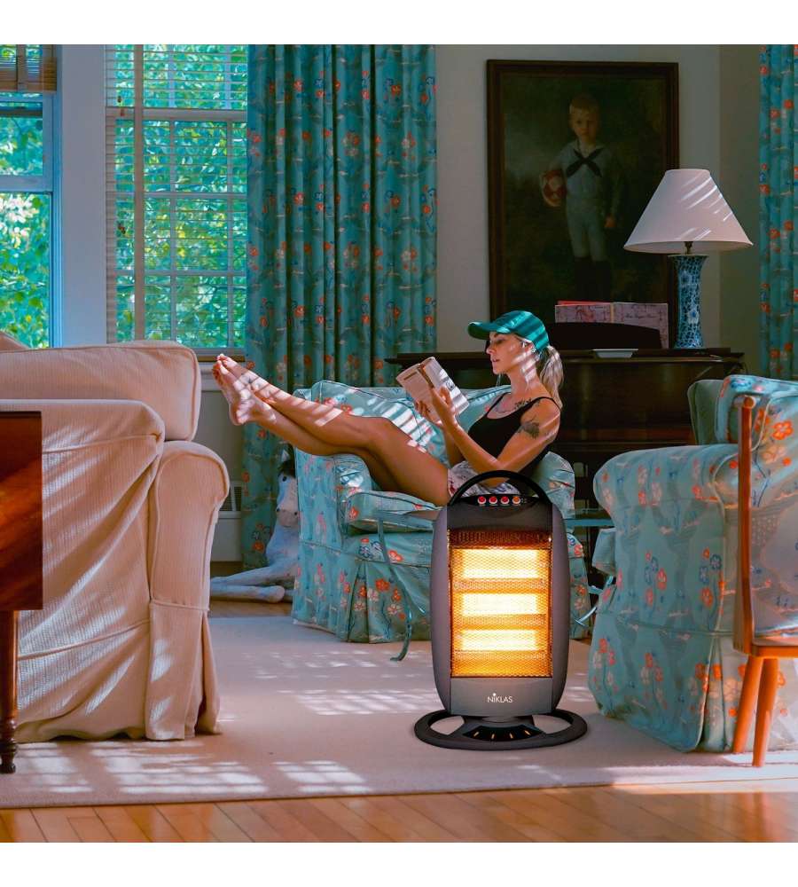 Descrizione: Scopri la Stufa Alogena Niklas Classic, compatta e potente. Con 3 livelli di potenza (400-800-1200W) e design oscillante, garantisce calore sicuro grazie al sistema anti-ribaltamento.