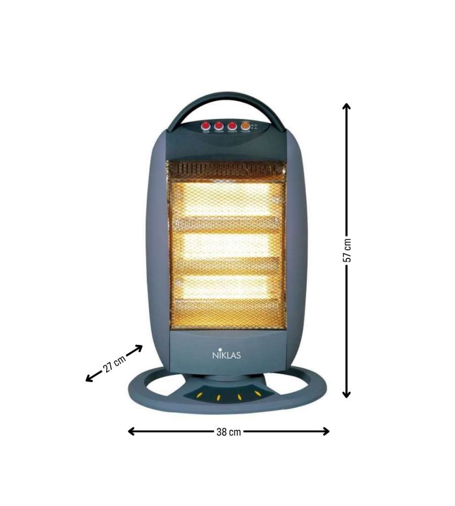 Stufa alogena Niklas da 1200W con corpo in ABS grigio. Tre livelli d'irradiamento (400-800-1200W), funzione oscillante e sistema di spegnimento in caso di ribaltamento. Dimensioni: 38x27x57 cm, ideale per riscaldare in sicurezza.Destinazione d'uso: