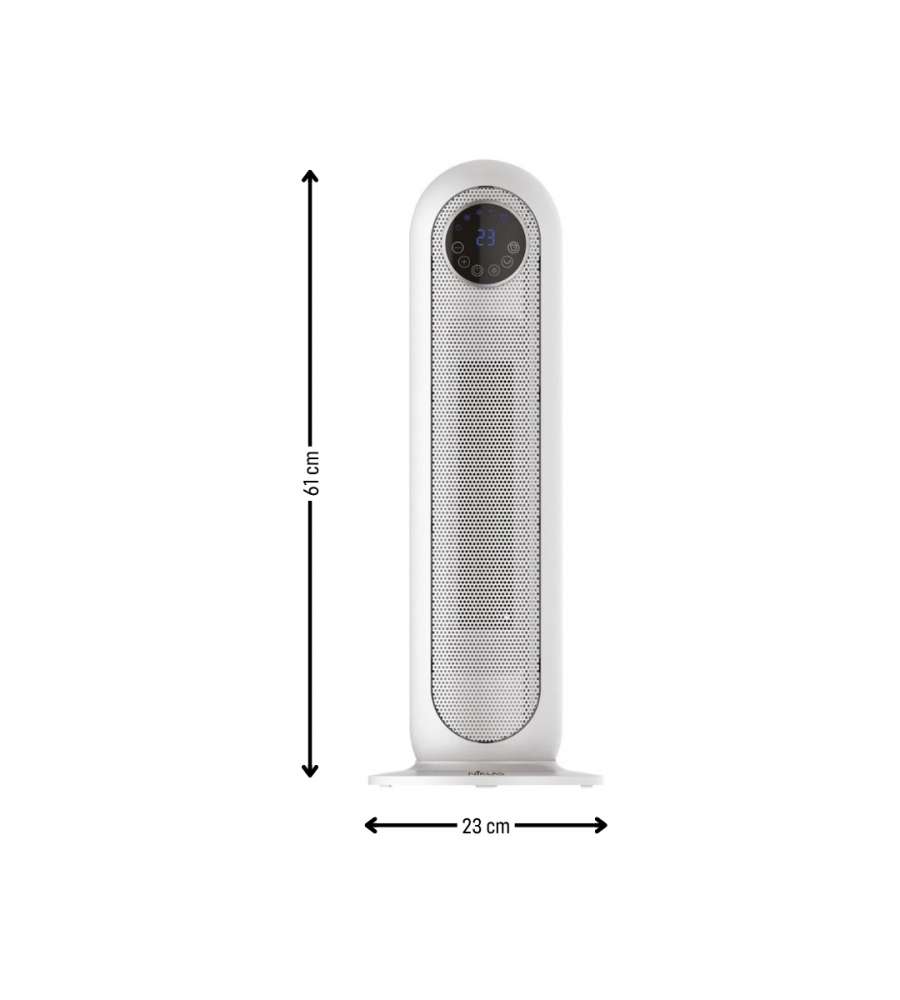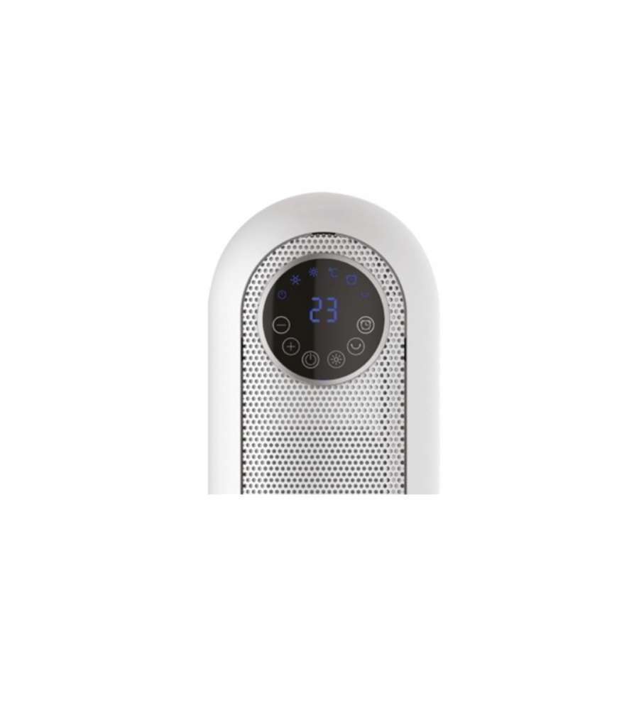 Descrizione: Termoventilatore PTC Niklas Digital Sky da 2000 Watt, silenzioso e sicuro. Selettore 3 modalità, timer, telecomando e funzione oscillante. Riscalda rapidamente ogni ambiente con protezione surriscaldamento. Dimensioni: 23x61 cm.