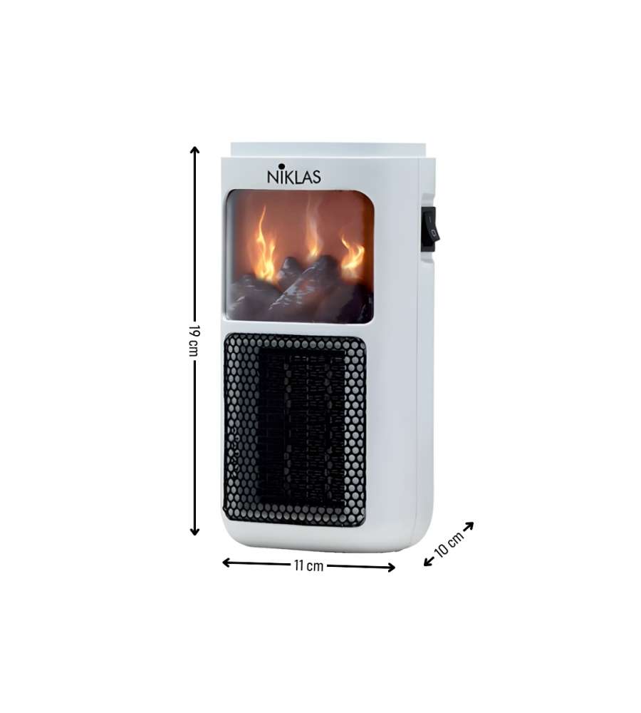Termoventilatore Niklas con erogatore ceramico PTC, potenza 400W, termostato regolabile 15°/45°, motore silenzioso, timer 12 ore, display digitale, autospegnimento. Dimensioni 11x10x19 cm, spina schuko rotante. Effetto fuoco vivo.Destinazione d'uso: