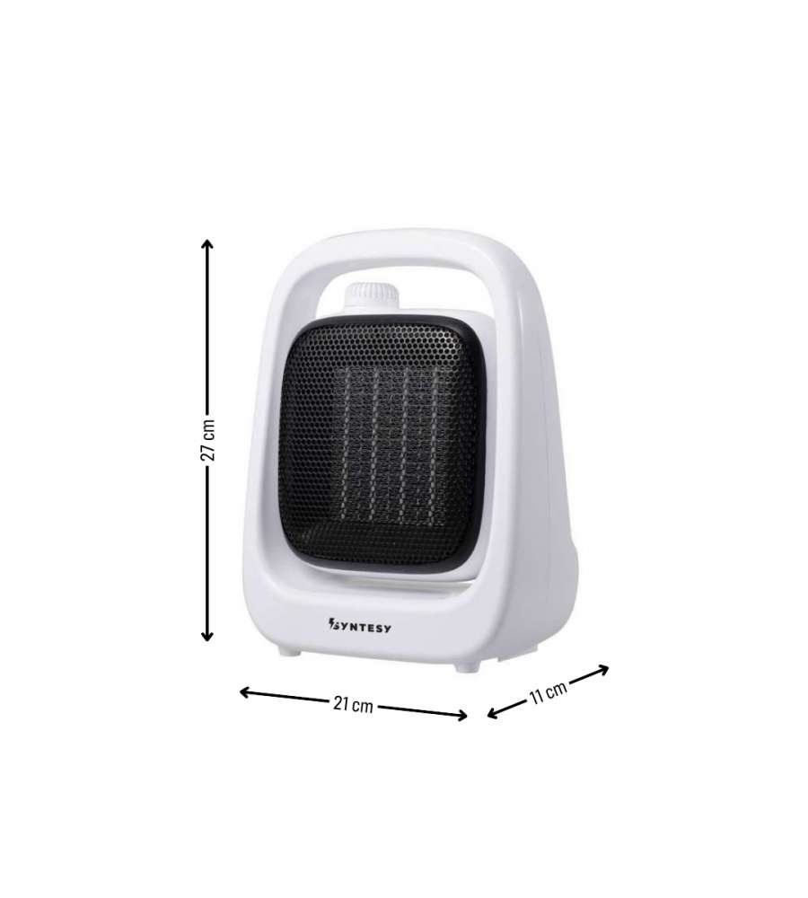 Termoventilatore ceramico compatto Syntesy, potenza 600/1200 W, dimensioni 21x11x27 cm e peso 1,22 kg. Termostato regolabile, sicurezza ribaltamento e protezione termica. Uso domestico, maniglia per il trasporto, inclinazione 30/60°.Destinazione d'uso: