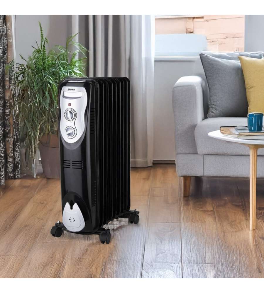 Descrizione: Radiatore ad olio nero Zephir 9 elementi, ideale per riscaldare con 3 livelli di potenza: 800W, 1200W, 2000W. Dotato di termostato regolabile, ruote per facile trasporto e sicurezze anti surriscaldamento e ribaltamento. Dimensioni 405x240x625 mm.