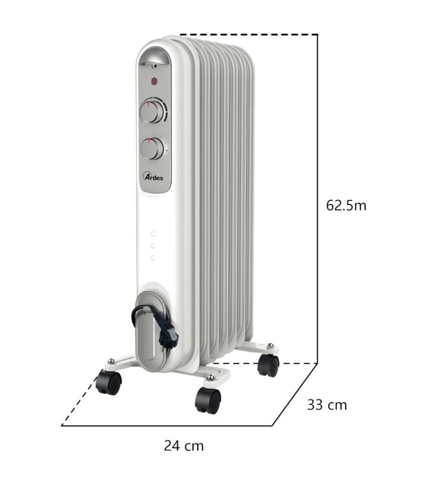 Descrizione: Termoradiatore ad olio Ardes Curvy con 7 elementi riscaldanti. Fino a 1500W, termostato regolabile e 3 livelli di potenza. Sicurezza anti-surriscaldamento e avvolgicavo integrato. Ideale per ambienti isolati.