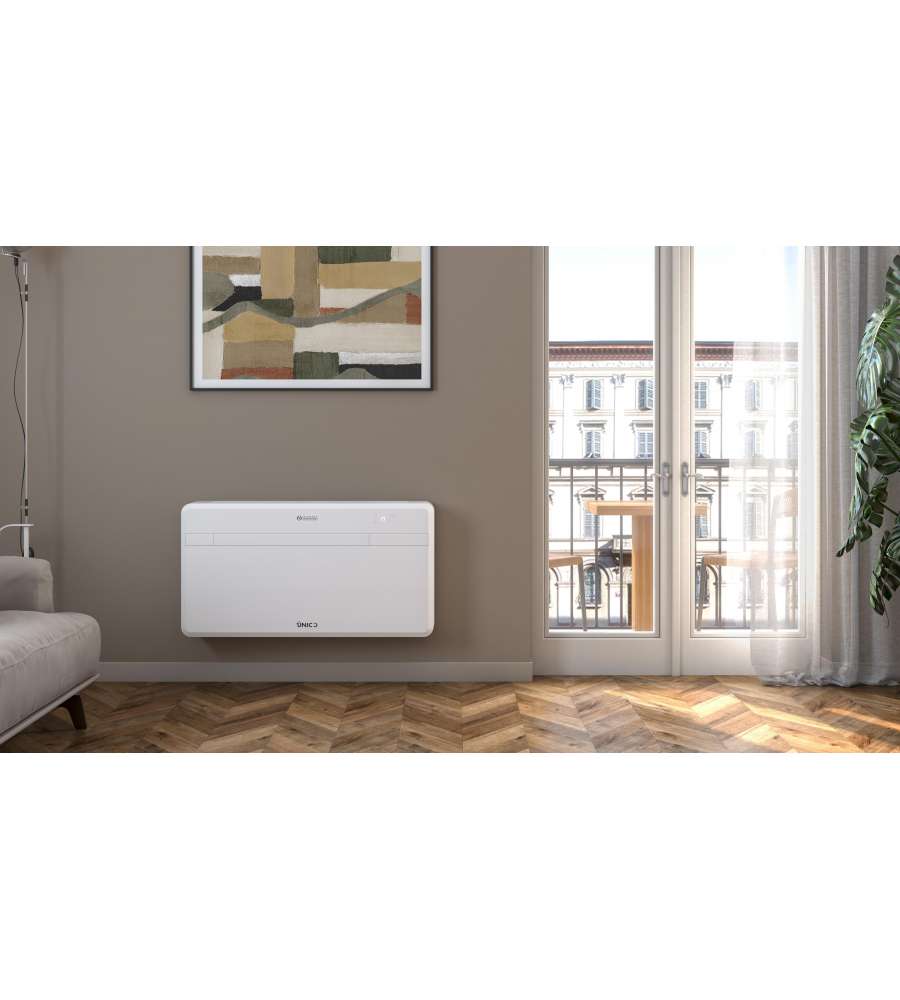 Descrizione: Climatizzatore Unico Next Olimpia Splendid, senza unità esterna e motore inverter. Potenza raffreddamento fino a 2,5 kW e riscaldamento 1,7 kW, modalità programmabile e basso impatto ambientale con gas R290. Silenzioso e efficiente!