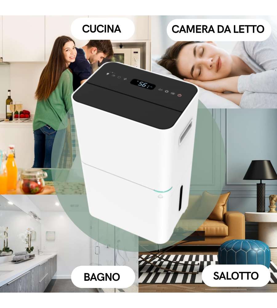 Deumidificatore compatto con assorbimento di 330W e portata d'aria di 200 mc/h. Capacità di deumidificazione di 20-24l/24h, serbatoio da 3,8l, funzioni di sbrinamento, igrostato, timer e display LED. Dimensioni: 35,5x25,5x57,2 cm, peso 17 kg.Altro 1: