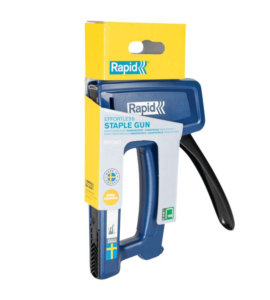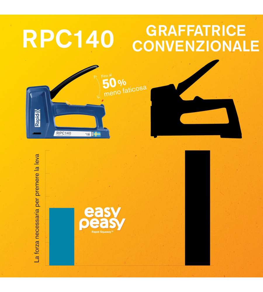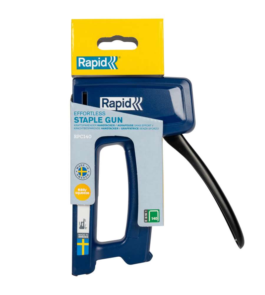 Descrizione: Graffatrice manuale Rapid RPC140, ideale per il fai-da-te. Tecnologia PowerCurve per un'aggraffatura fino al 50% meno faticosa. Perfetta per fissare materiali pesanti. Realizzata in Svezia con plastica ABS resistente.