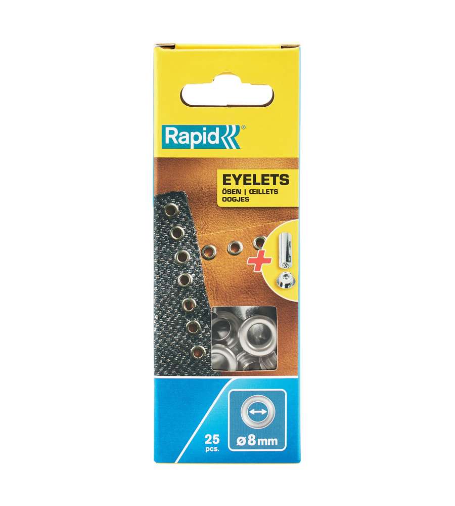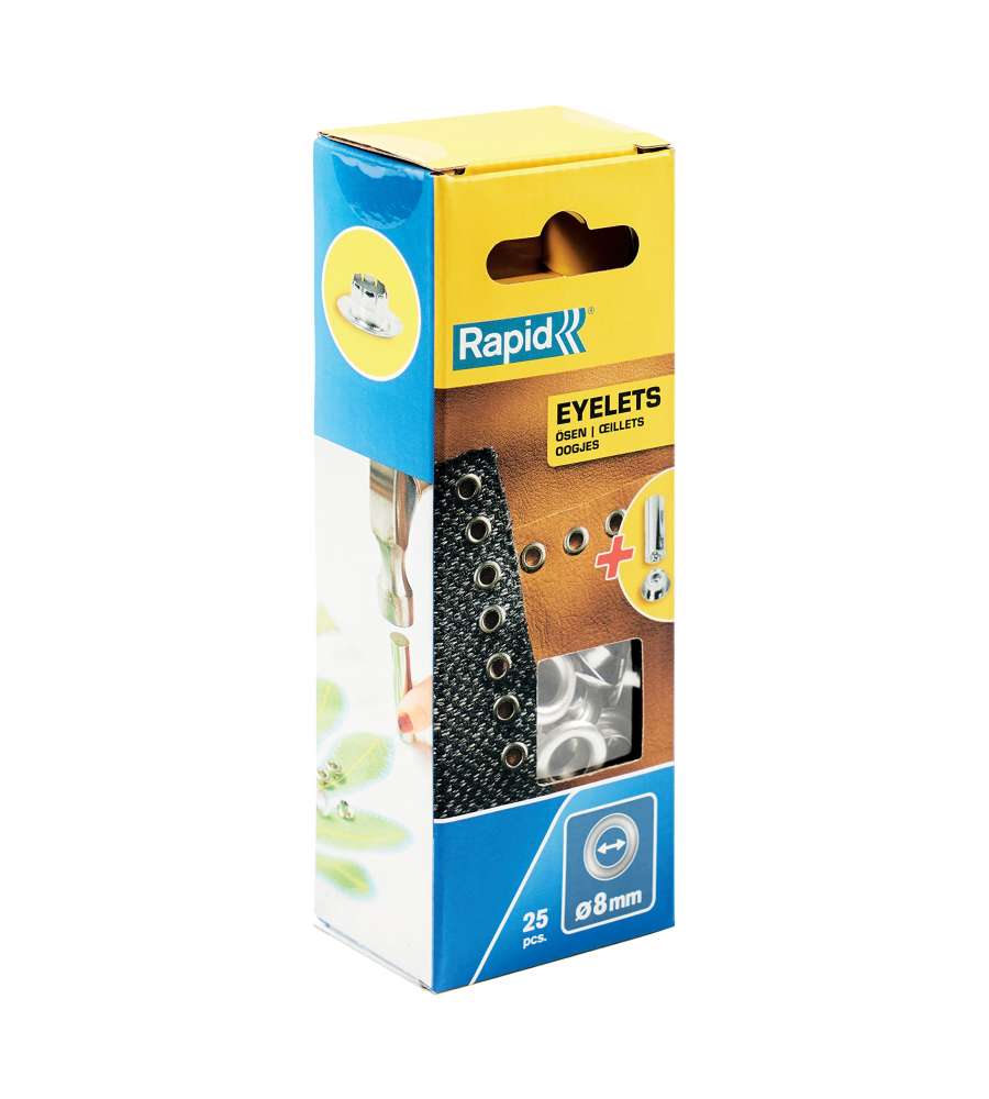 Descrizione: Occhielli in alluminio Ø8 mm, 25 pz con ribattitore incluso. Ideali per rinforzare fori su tessuti, borse e scarpe. Fissaggi duraturi e installazione semplice. Perfetti per progetti fai-da-te!