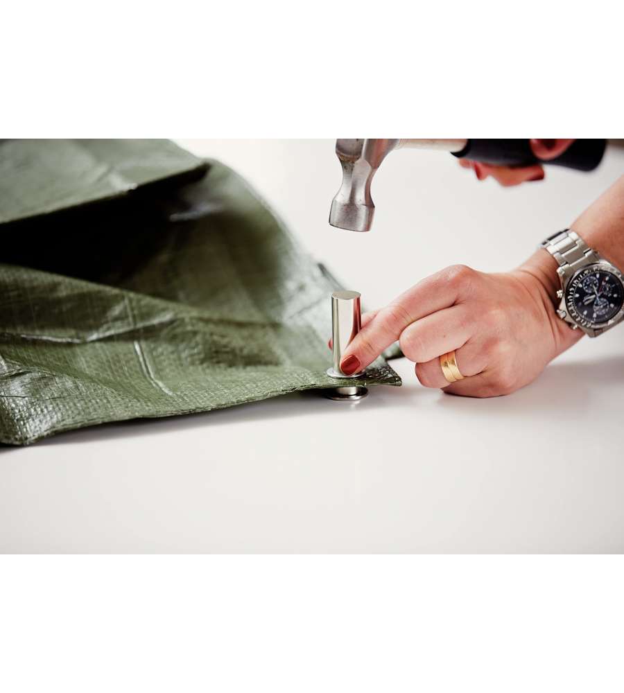 Occhielli in acciaio di alta qualità per rinforzare fori su teloni, tende e borse. Diametro interno 12 mm, esterno 23 mm. Set di 25 pezzi con applicatore incluso, facile montaggio. Finitura in alluminio per resistenza in ambienti umidi.Garanzia: