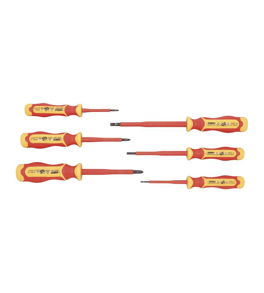 Descrizione: Scopri la serie di giraviti isolati Fervi, perfetti per lavori elettrici. Include 6 misure: da 0,6 a PH2. Realizzati in Mo-V con finitura fosfatata per resistenza e durata. Sicurezza garantita!