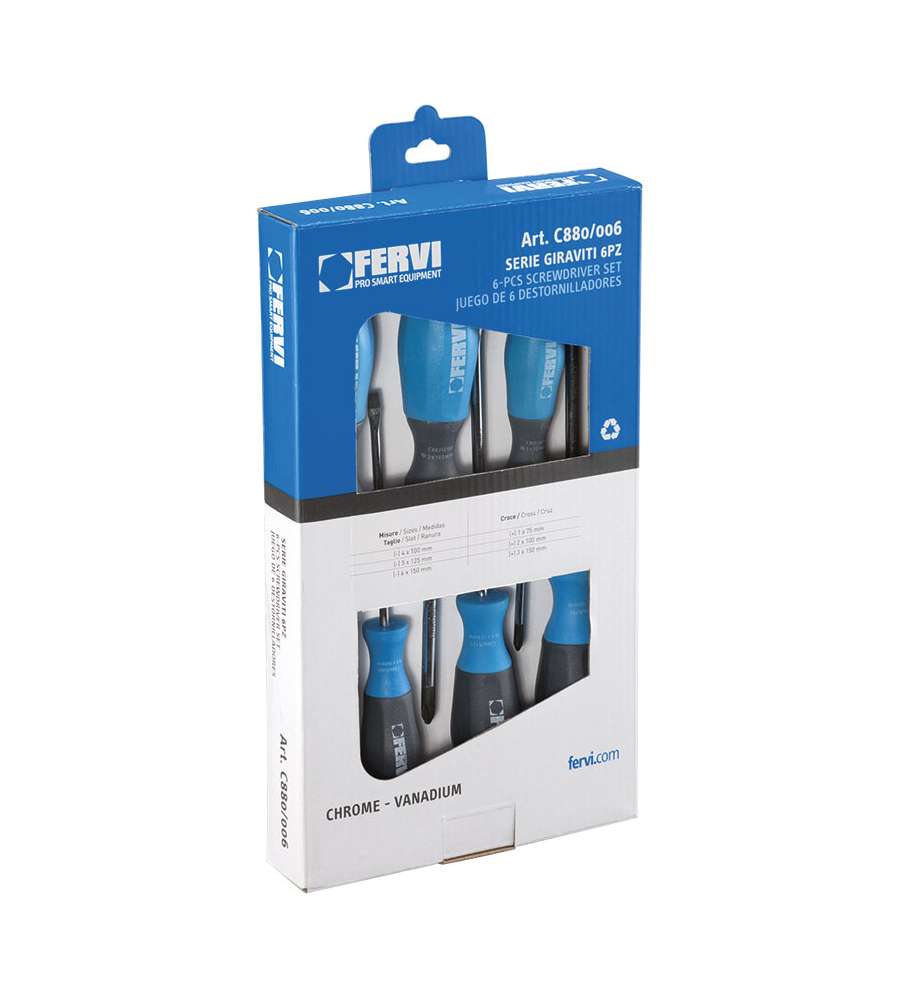 Set di giraviti magnetici Fervi, comprende 3 cacciaviti a taglio (4x100 mm, 5x125 mm, 6x150 mm) e 3 a croce (PH 1x75 mm, PH 2x100 mm, PH 3x150 mm). Realizzati in Cr-V, finitura cromata, ideali per usi generali. Isolati per sicurezza.Altro 1: