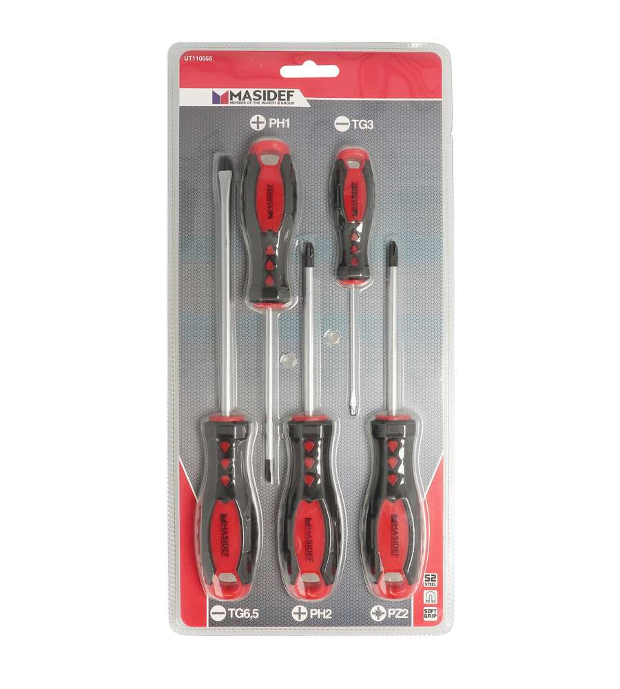 Set 5 giraviti Taglio Phillips Pozidrive: Giravite taglio TG3 75mm - Giravite taglio TG6,5 100mm - Giravite Phillips PH1 100mm - Giravite Phillips PH2 100mm - Giravite Phillips PZ2 100mm - Acciaio strutturale S2 - Punta magnetica - Manica morbida