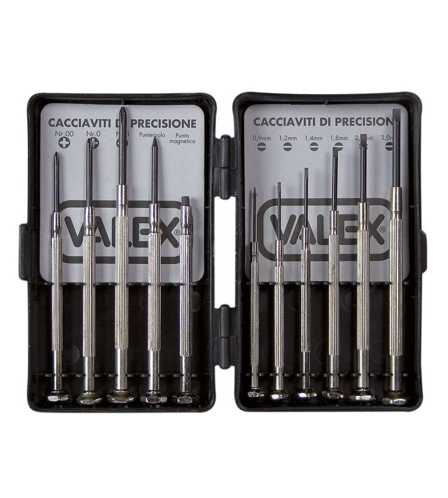 Set di 11 cacciaviti di precisione Valex, con punte in acciaio brunito. Include 6 cacciaviti a taglio e 3 Phillips, punteruolo e punta magnetica. Ideali per lavori di precisione, lunghezza da 73 a 108 mm, terminale girevole.