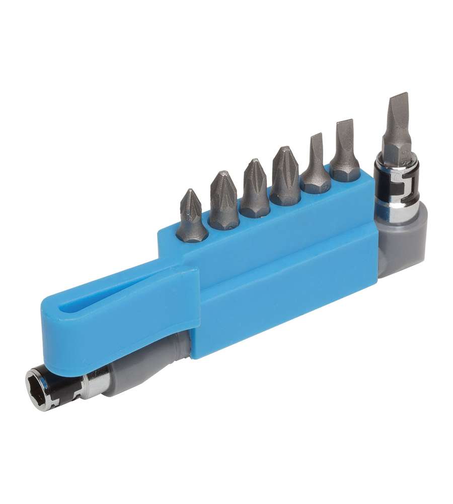 Porta inserti Fervi 0407 con 7 inserti a croce e taglio, lunghezza 105 mm. Realizzato in Cr-V, finitura satinata. Design a 90° per lavorare in spazi ristretti, ideale per hobbisti e professionisti. Peso 0,22 lbs.Altro 1: