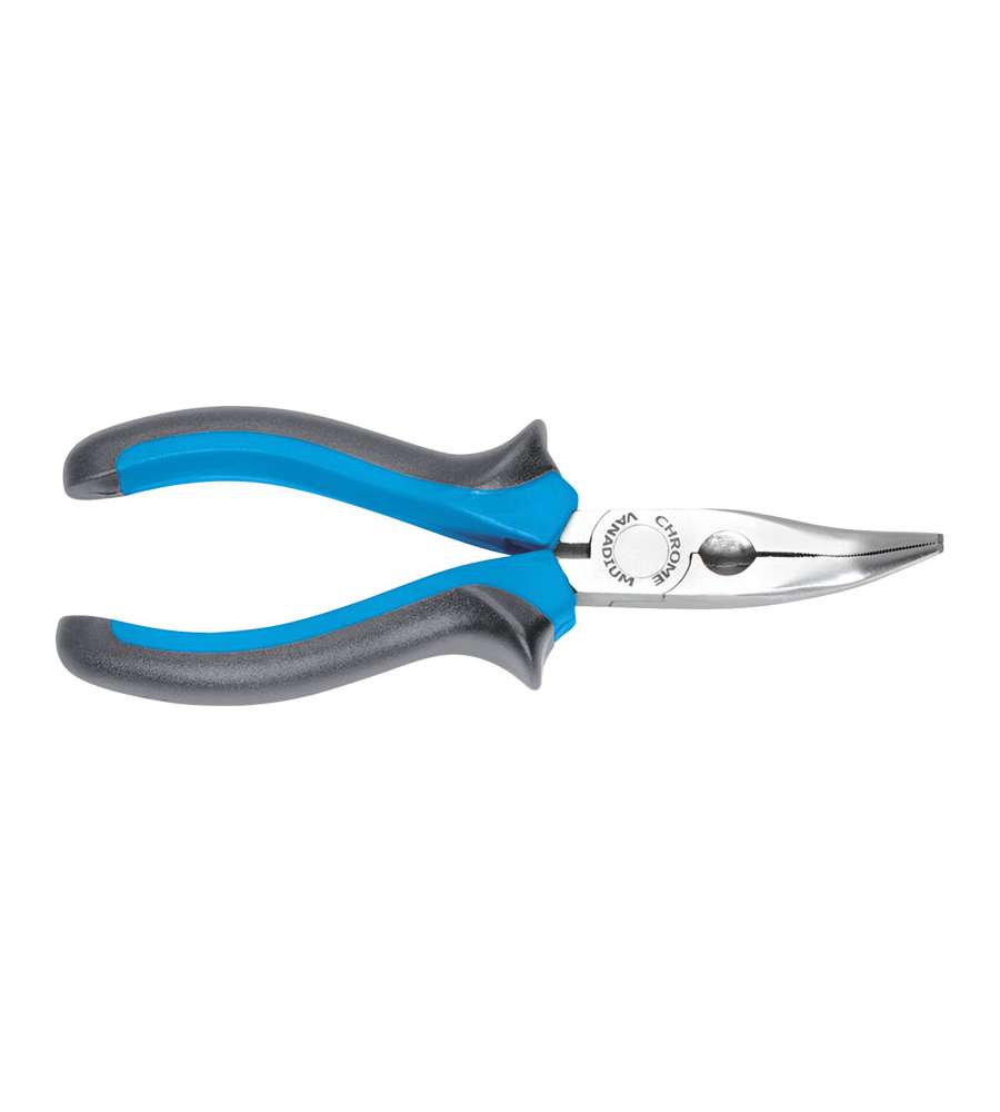 Pinza a becchi mezzitondi piegati 45°, lunghezza 200 mm e spessore 10 mm, realizzata in acciaio Cr-V con finitura cromata. Ideale per lavori di precisione e per raggiungere punti difficili. Ergonomica e resistente.Altro 1: