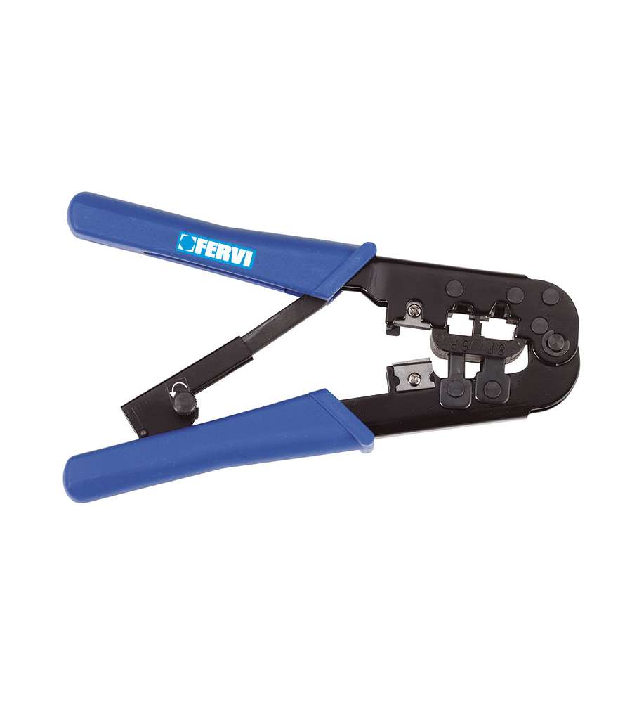 Pinza crimpatrice Fervi per connettori RJ-11, RJ-12 e RJ-45. Dotata di spellafili integrato, manico ergonomico in PVC antiscivolo e manopola di sbloccaggio. Ideale per cavi telefonici e di rete. Colore blu.Altro 1: