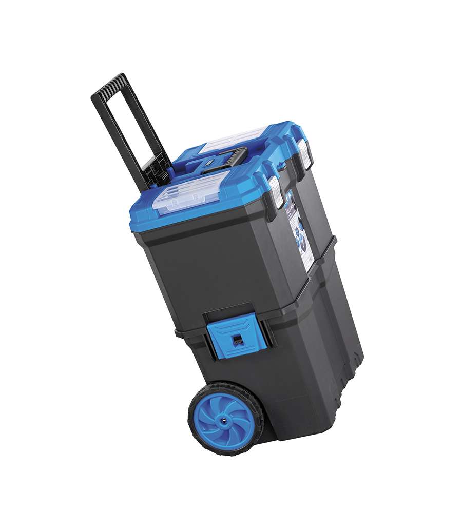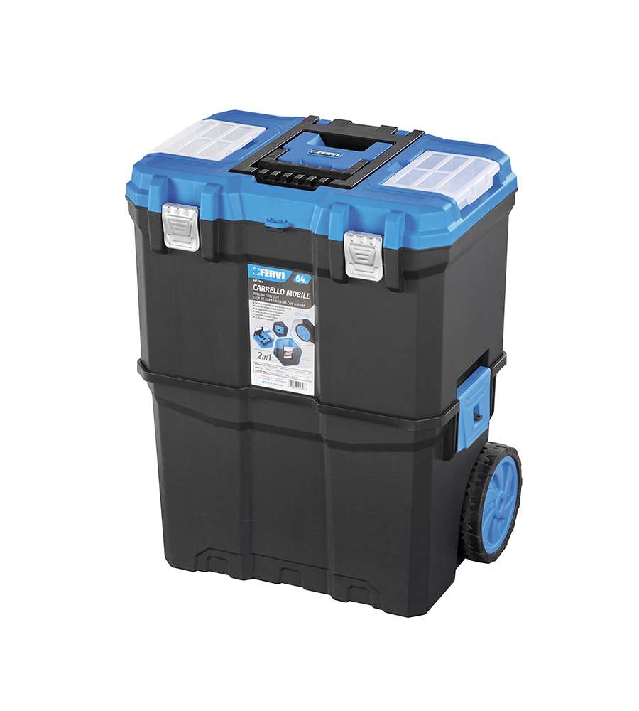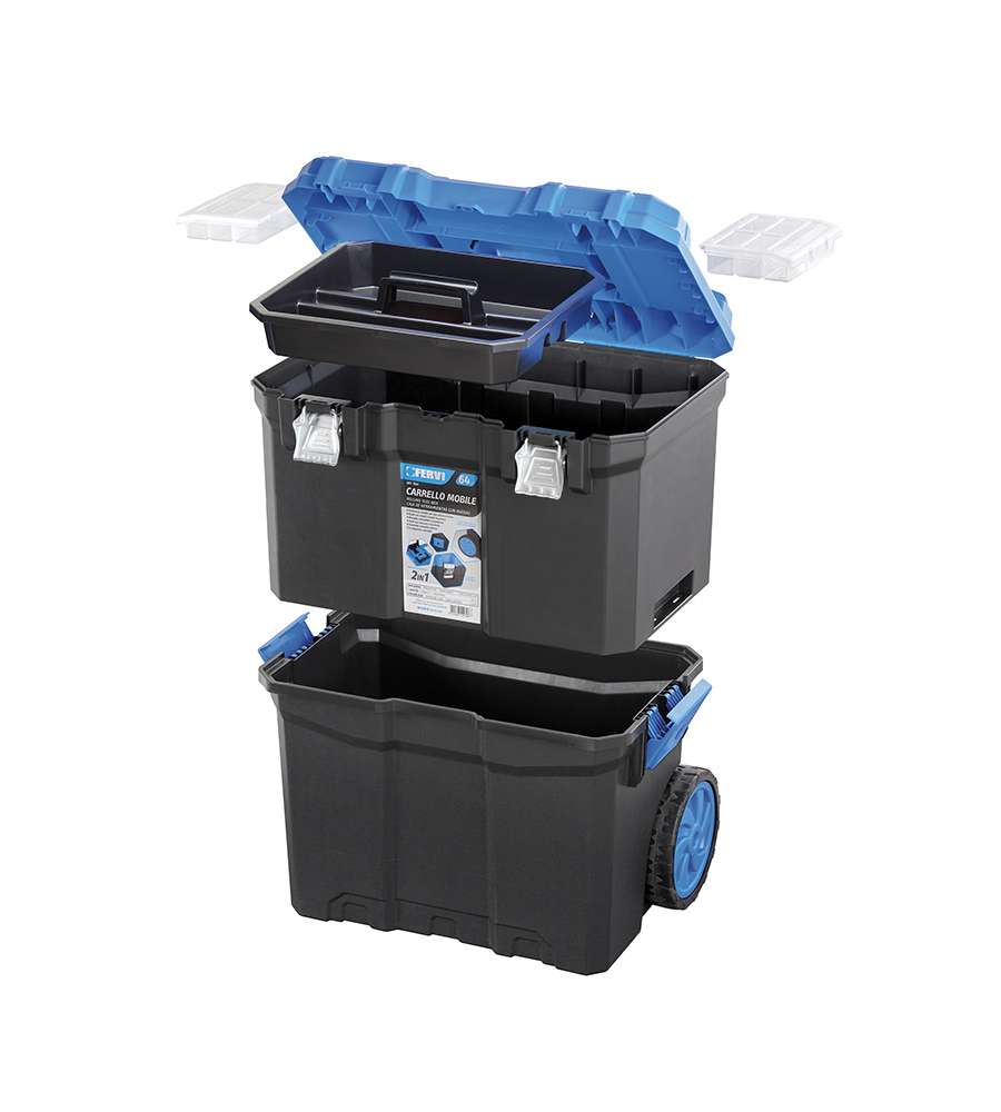 Carrello mobile 2in1 con vaschetta interna, 2 organizer estraibili e maniglia richiudibile. Cerniere in metallo, asole per lucchetto, ruote con cingoli in gomma. Dimensioni 485x330x625 mm, capacità 64 Lt, portata max 25 Kg.Altro 1: