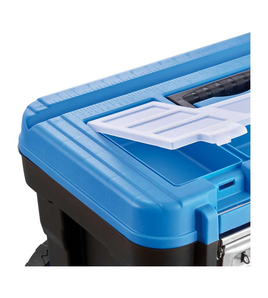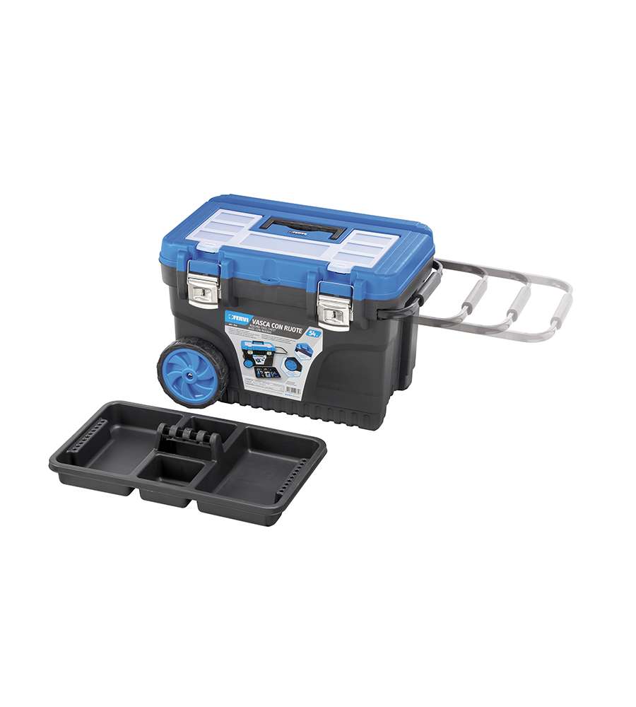 Descrizione: Vasca con ruote Fervi TB21, 60x40x42 cm, ideale per stoccare attrezzi e materiali. Organizer integrato, cerniere in metallo e maniglione ergonomico. Capacità 54 Lt, portata max 25 kg. Solida e pratica!