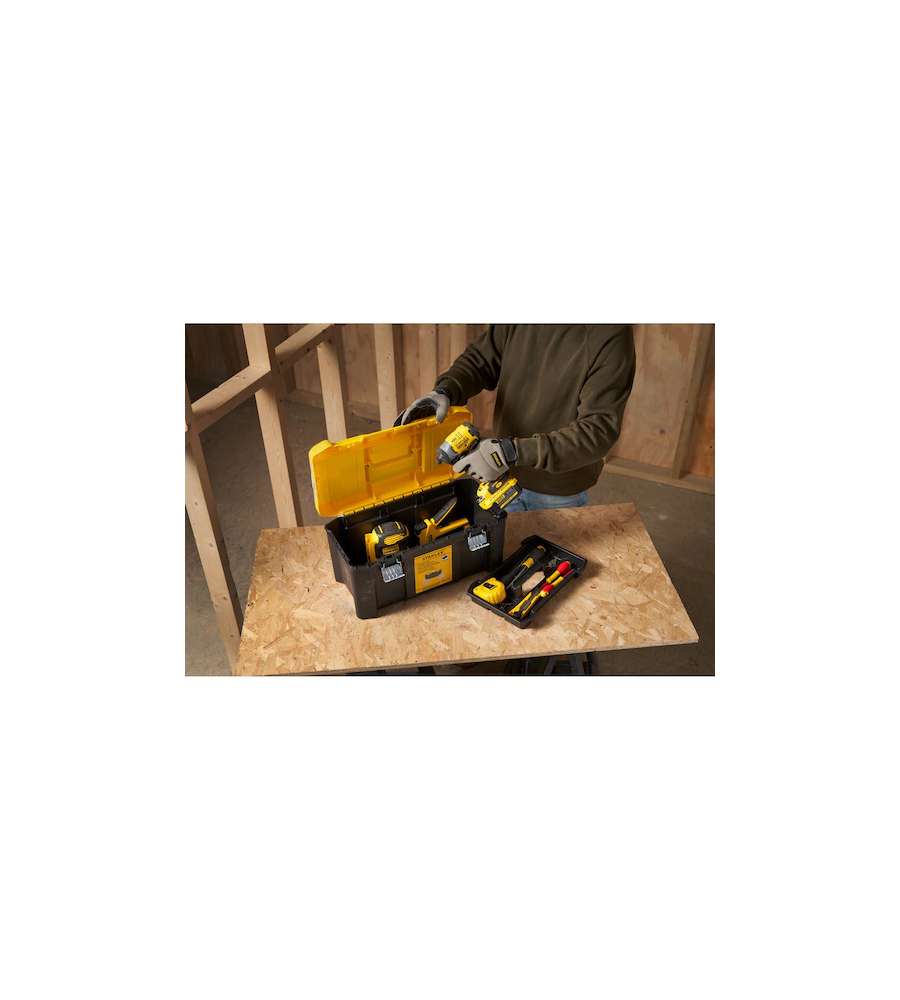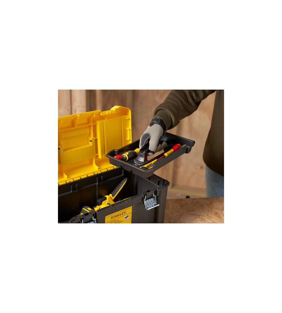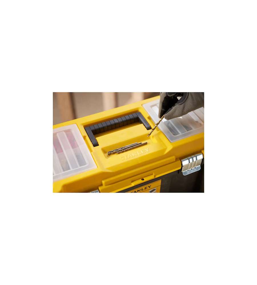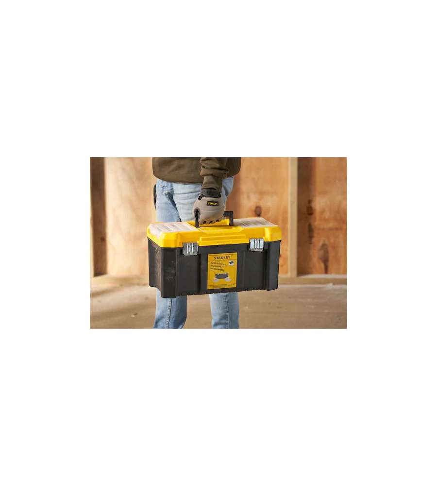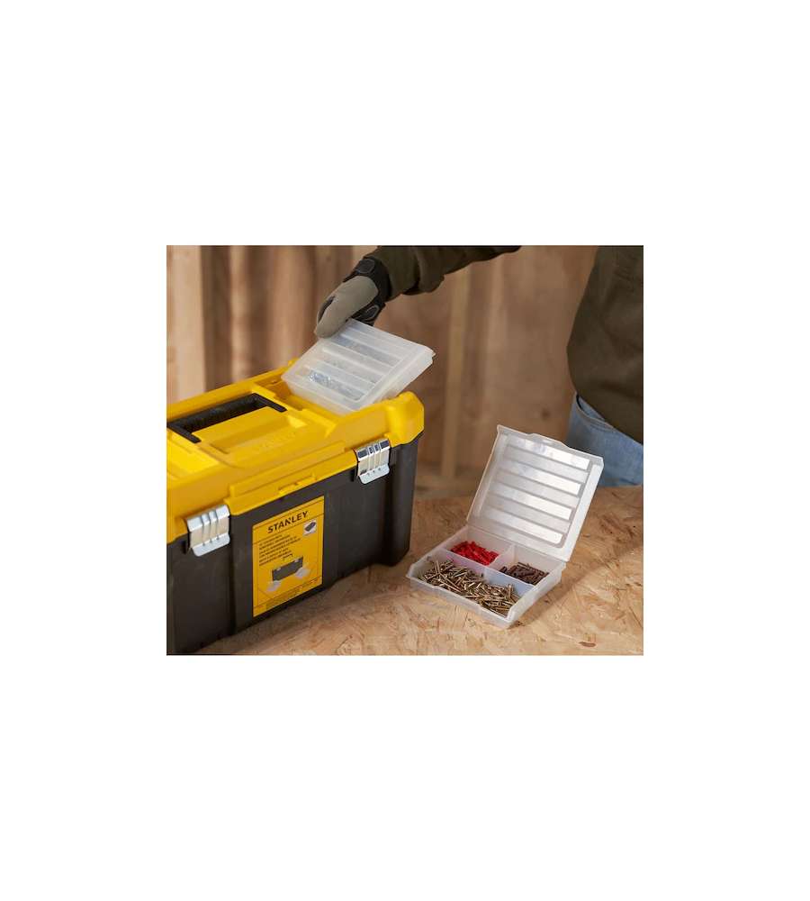 Descrizione: Cassetta porta utensili Stanley Essential 19" in polipropilene, con due organizer removibili e cerniere in metallo. Capacità 8 kg, incavo per viti e chiusura a lucchetto. Ideale per mantenere in ordine i tuoi attrezzi.