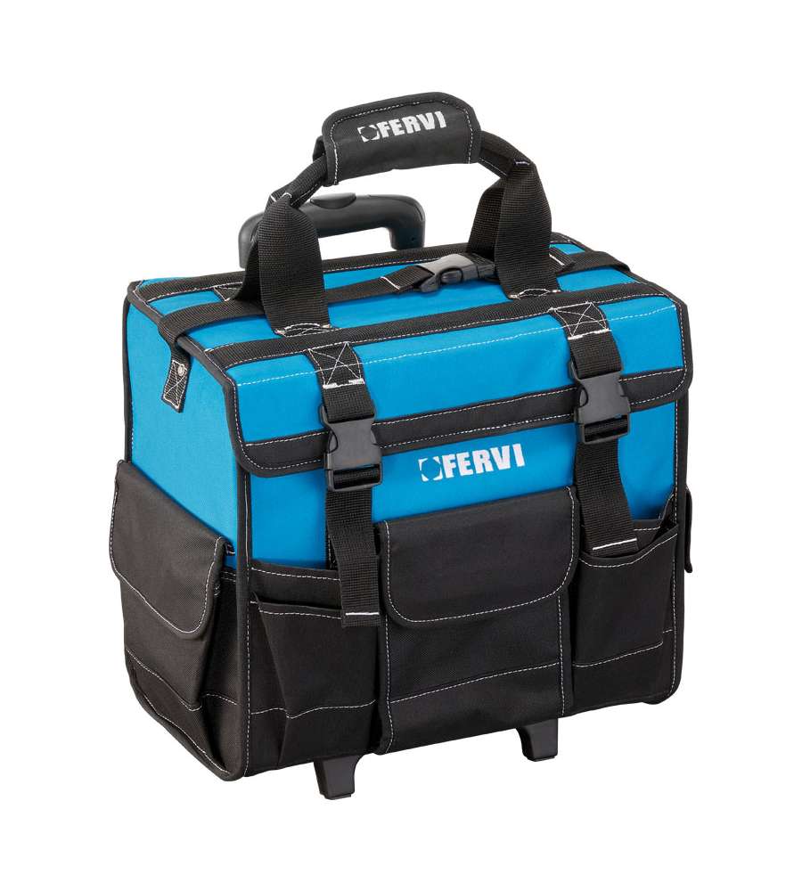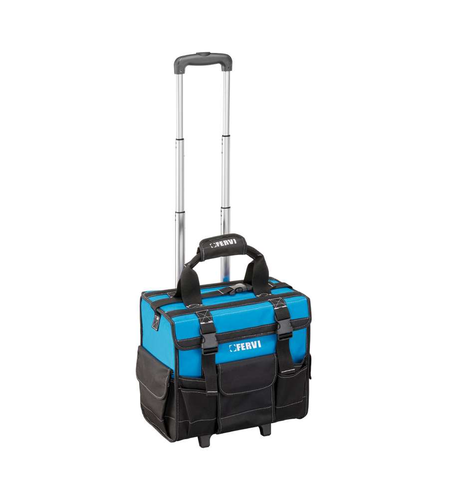 Descrizione: Trolley portautensili semi morbido Fervi, in poliestere 600D, con manico telescopico e apertura frontale a strappo. Organizza i tuoi attrezzi con numerose tasche resistenti. Dimensioni: 41x31x44,5 cm.
