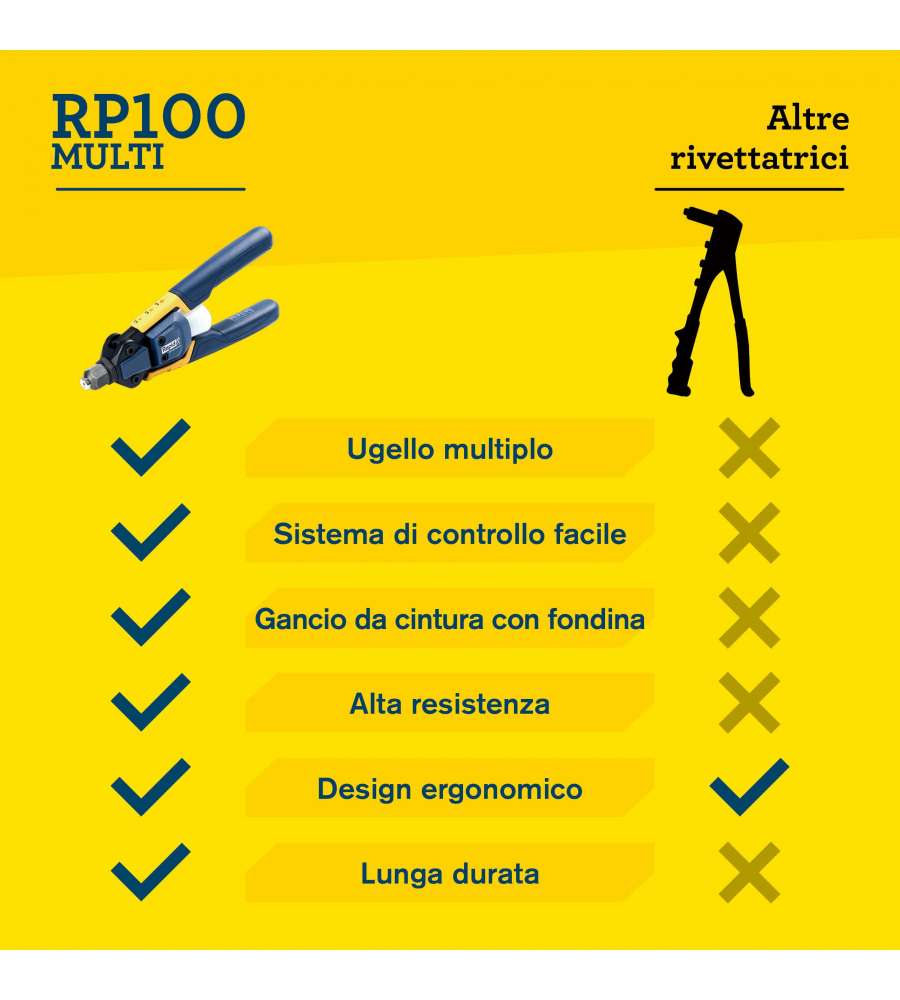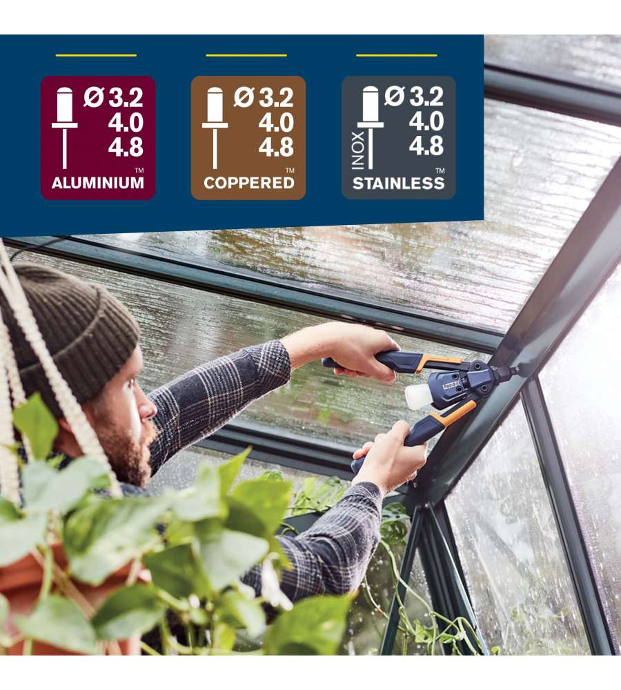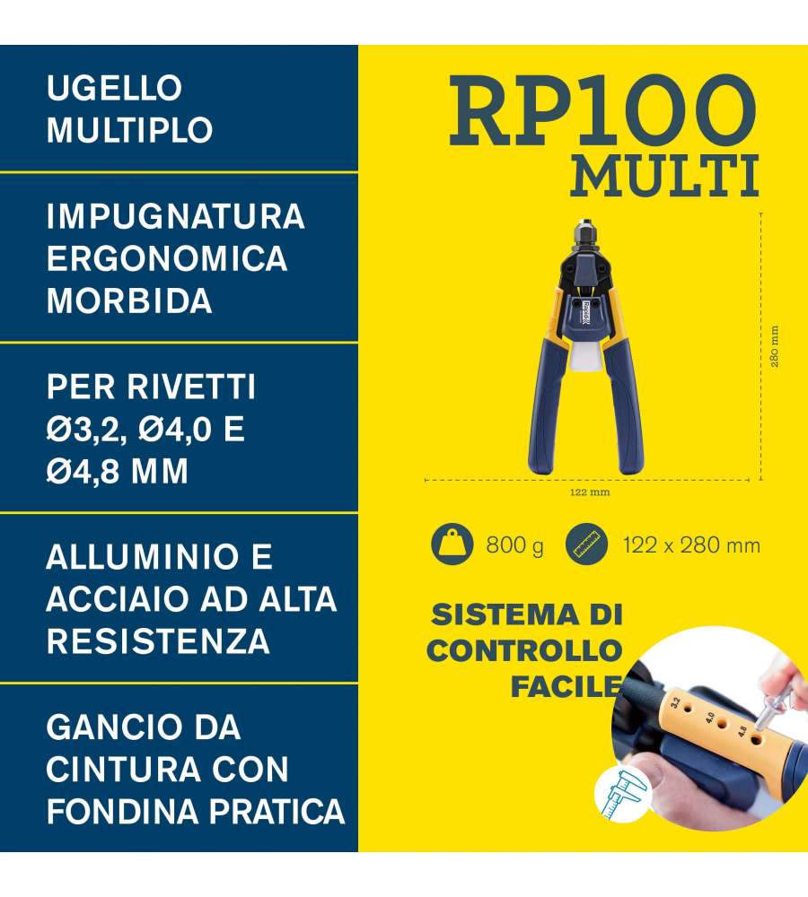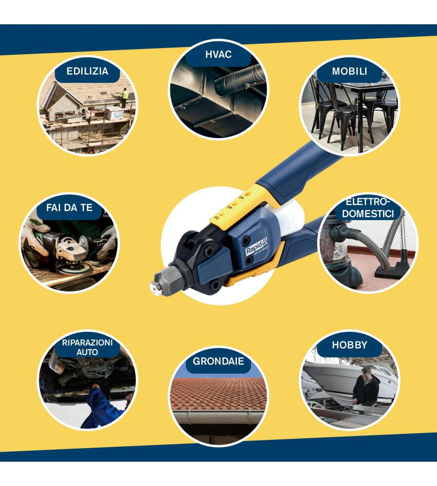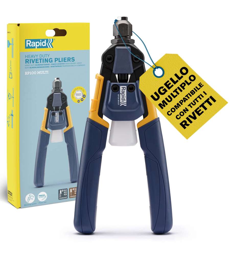 Descrizione: Rivettatrice manuale Rapid RP100 con tecnologia multi-ugello, per rivetti da 3,2 a 4,8 mm in alluminio, acciaio e rame. Ergonomica e leggera, ideale per progetti fai-da-te e lavori di lamiera.